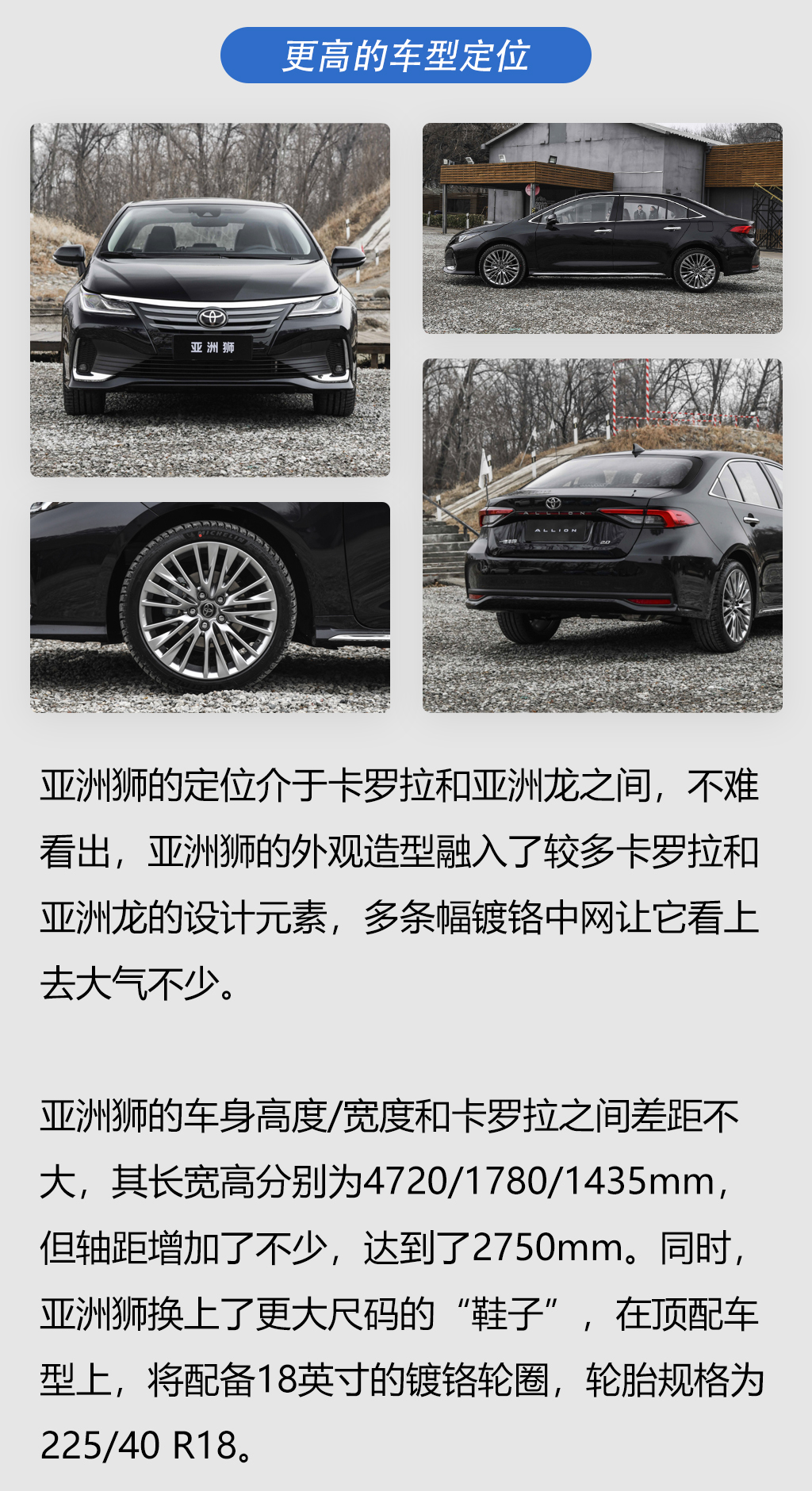 我们不难发现,亚洲狮和卡罗拉有着诸多的相似之处,外观造型能够看到卡罗拉的一些元素,内饰造型几乎完全套用其设计。但毋庸置疑的是,亚洲狮有着更高的定位,在加长轴距之后,它能够给后排乘客带来更好的空间表现,且在动力层面,亚洲狮也有着明显优势,2.0L自然吸气发动机在动力储备上的表现会更好。
