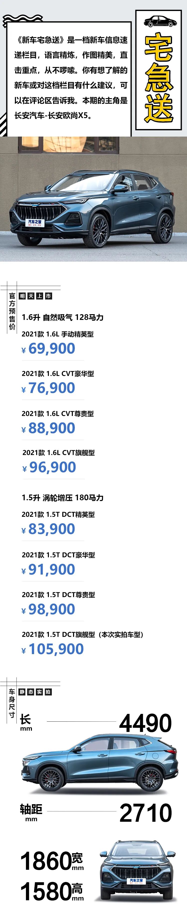 长安欧尚X5是长安汽车旗下又一款新的紧凑型SUV,它基于MPA专属SUV平台打造而来,与早前推出的长安欧尚X7相比,它的定位更年轻,目标受众群体的年龄层次在25-35岁之间。欧尚X5将于明天上市,提供1.6L自然吸气和1.5T涡轮增压发动机,预售价区间为6.99-10.59万元,下面我们通过一组长图了解一下它。