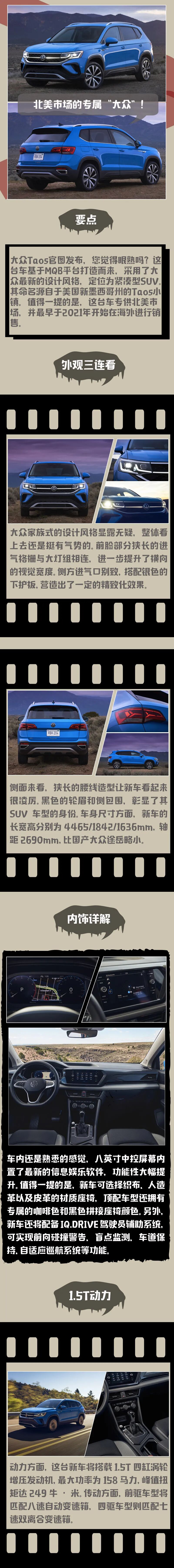 在中国的汽车市场中,大众集团可以说是顺风顺水,在各个级别的车型当中都有不错的销量,市场占有率非常的高。近两年来,大众集团在不断的推出SUV车型,试图再次像当年的途观一样,席卷整个SUV市场。而反观北美市场,大众就表现的很一般了。这不赶紧发布了Taos车型的官图,其命名源于美国新墨西哥州的小镇Taos,基于大众MQB平台打造而来。虽然这台车是专门为北美市场而研发的,但我们看看热闹也无妨!