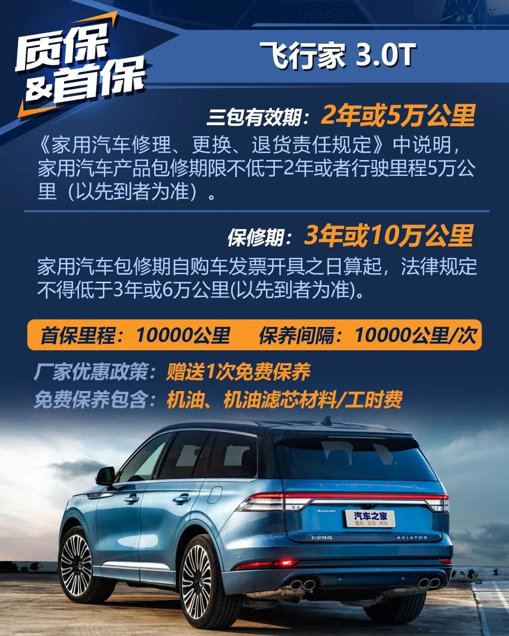 2019年11月,飞行家以进口车身份在国内上市了,它基于CD6后驱平台打造而来,定位为六/七座布局的中大型SUV。2020年7月,林肯又将其实现了国产,全系搭载3.0T V6双涡轮增压发动机,售价进一步降低,下面我们就来了解一下它在保养及其它费用方面的信息。