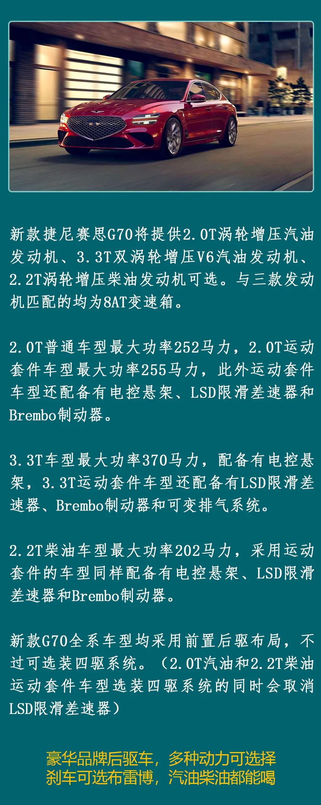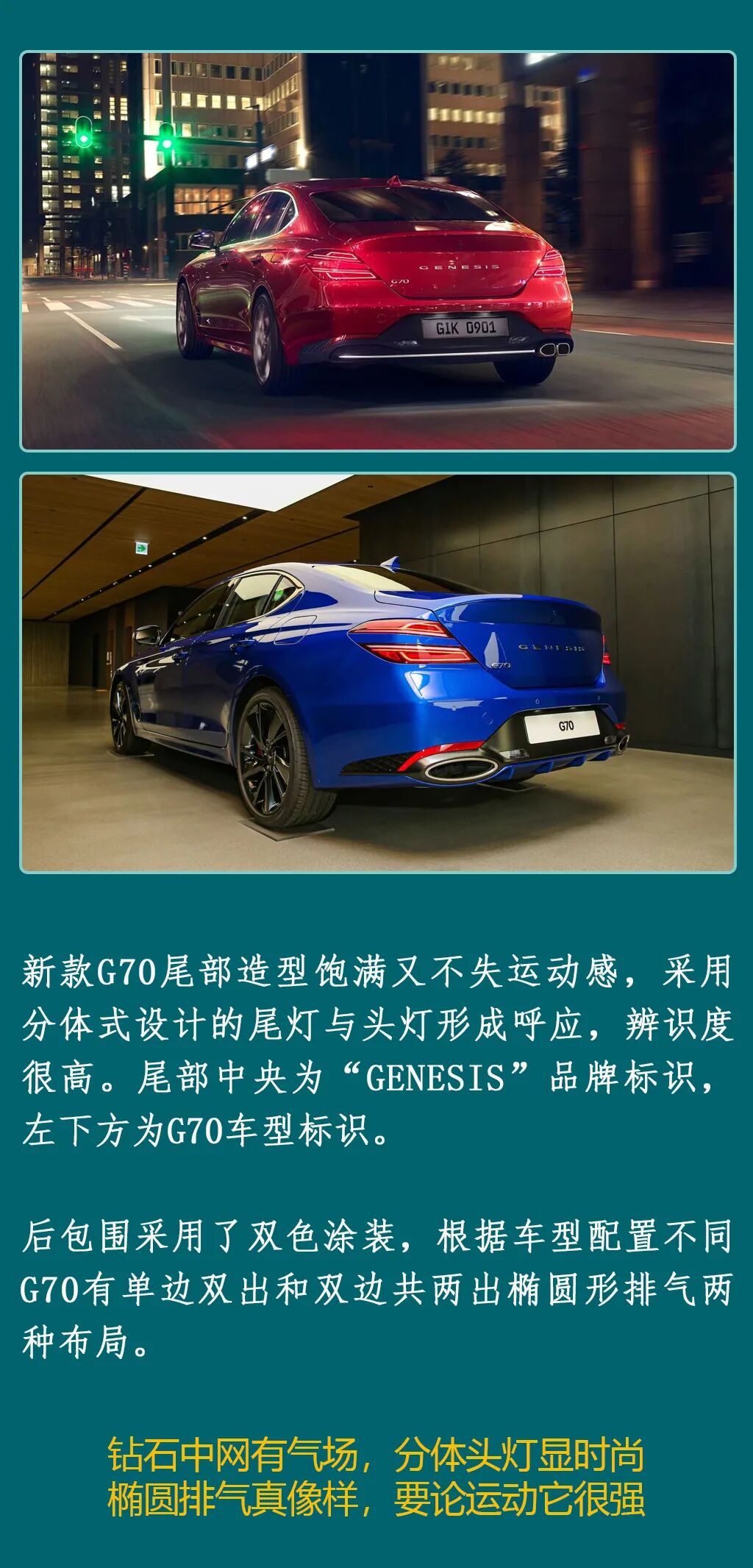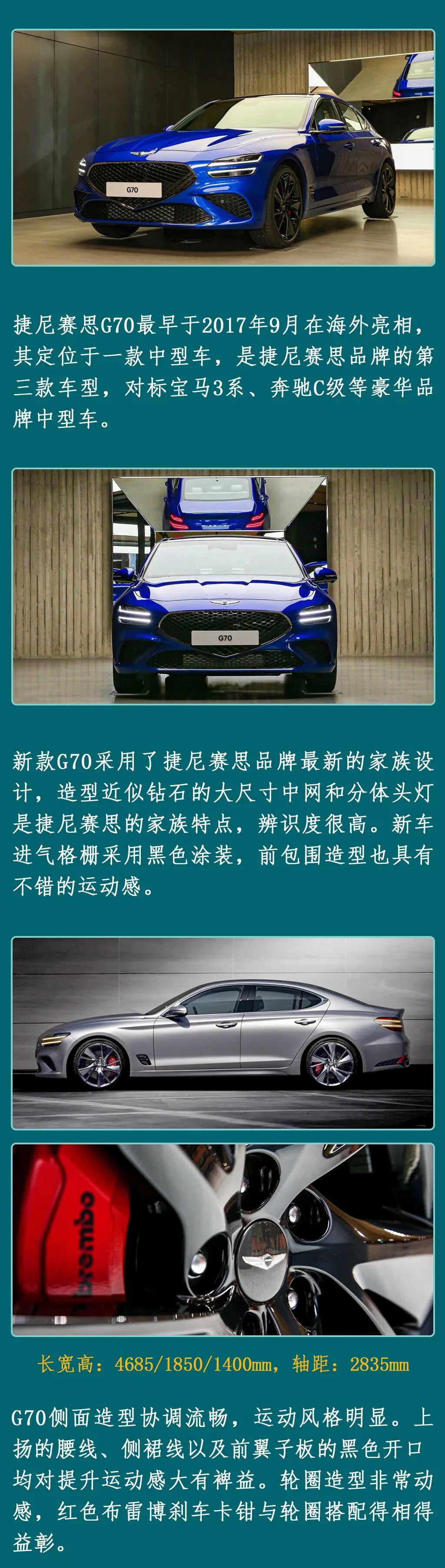 作为一款主打运动的豪华品牌中型车,新款捷尼赛思G70外观具有出色的运动感。前置后驱(可选装四驱系统)、提供性能版车型可选也契合运动中型车的定位。从静态来看新款G70已经具备了与宝马3系、奔驰C级等豪华品牌中型车抗衡的实力。