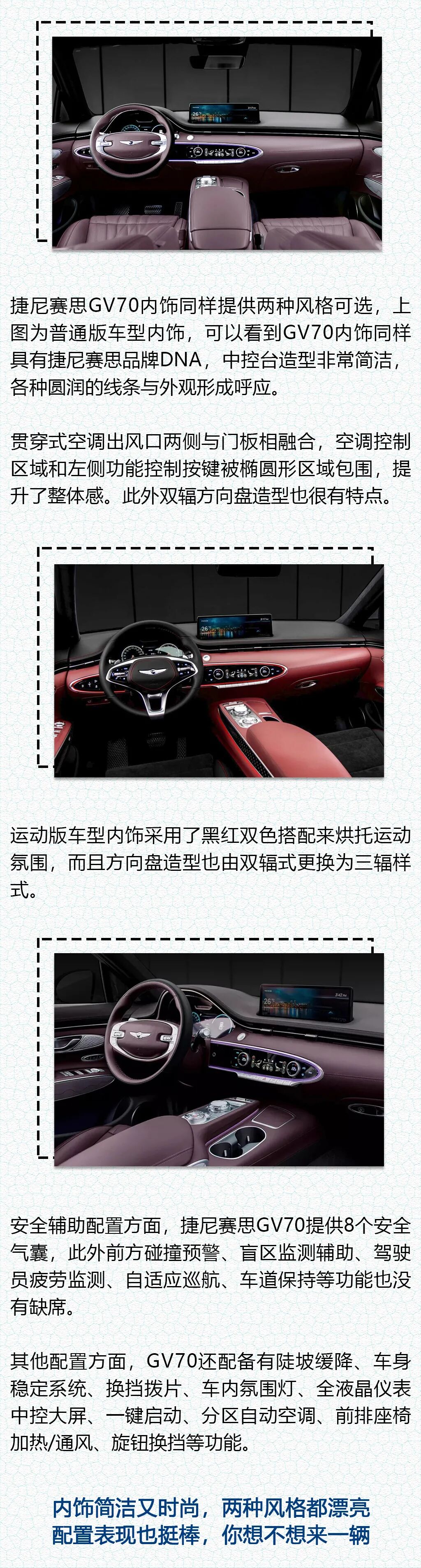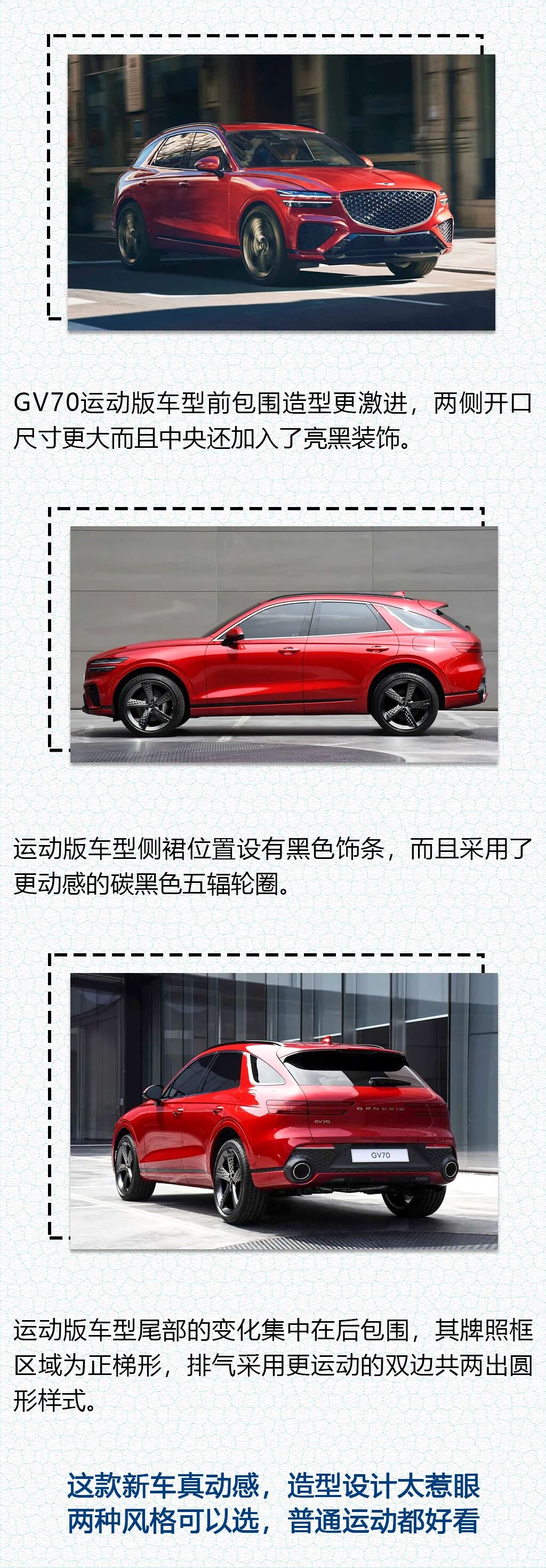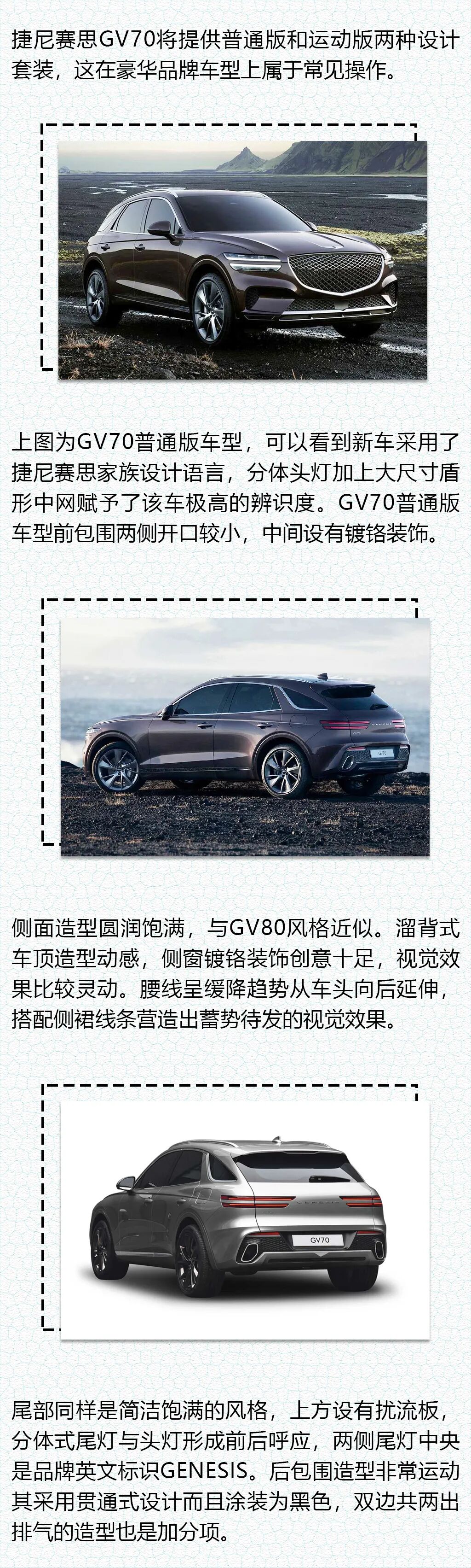 GV70外观设计非常动感同时也有颇高的辨识度,此外内饰也有浓郁的家族气息。提供三款发动机以及两驱/四驱车型丰富了消费者的选择。捷尼赛思GV70的加入丰富了该品牌的SUV产品矩阵,其上市后将与宝马X3、奔驰GLC以及奥迪Q5等车型展开竞争。