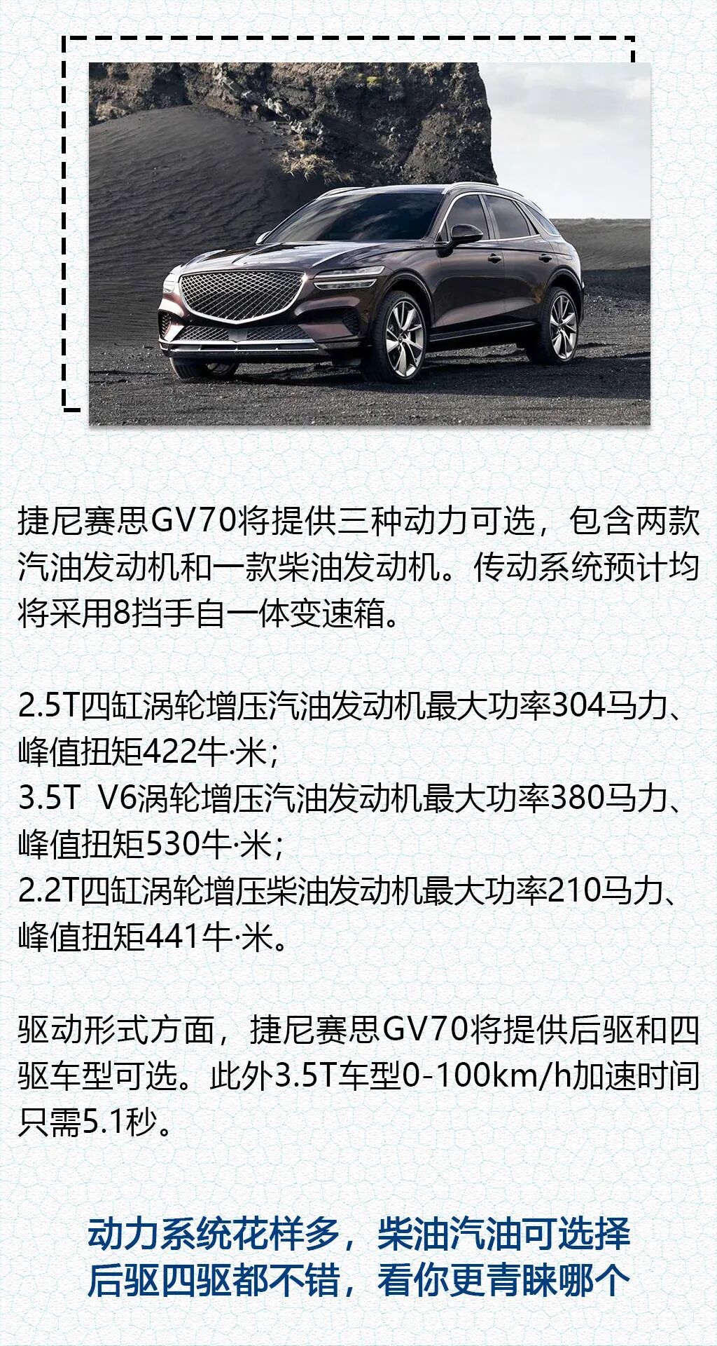 捷尼赛思GV70将提供三种动力可选,包含2.5T和3.5T汽油发动机以及2.2T涡轮增压柴油发动机。传动系统方面预计三款发动机均将匹配8挡手自一体变速箱。