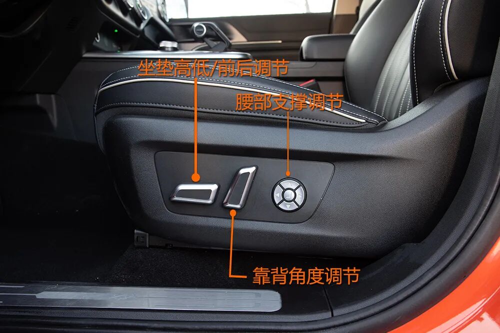 座椅造型宽大,皮质触感细腻,填充物柔软,用浅色缝线加以点缀。主驾驶位座椅采用六向电动调节,腰部支撑为四向电动调节;副驾驶位座椅采用四向电动调节;前排两张座椅都具备加热功能,驾驶位座椅还有按摩功能。