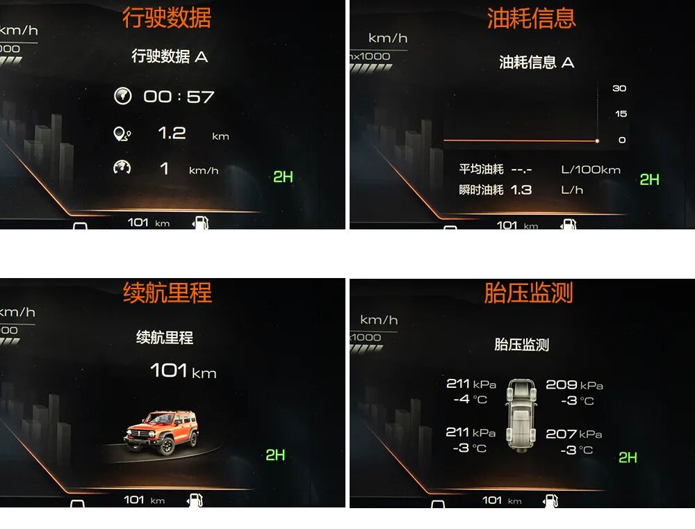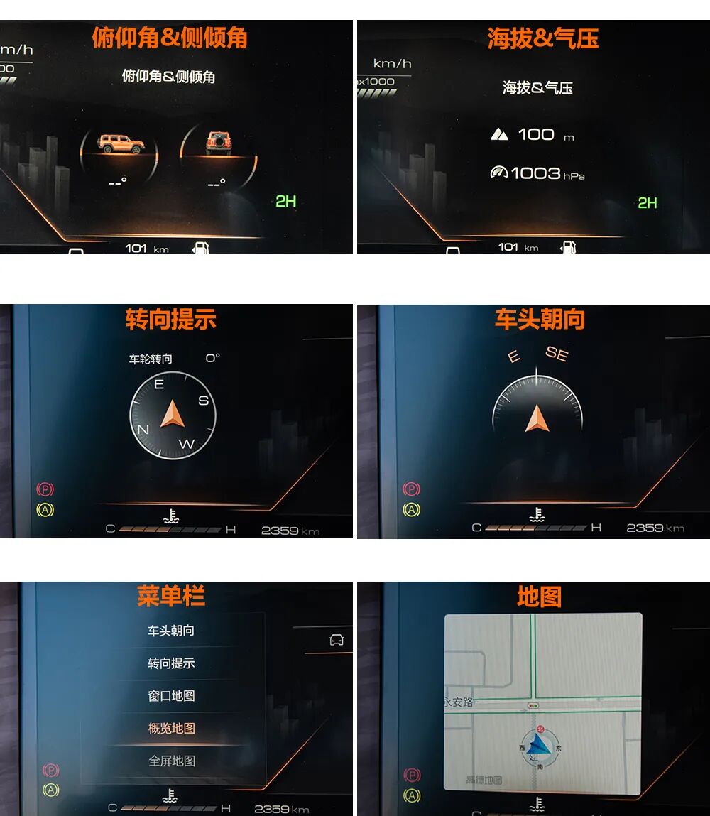 全液晶仪表盘面积为12.3英寸,UI设计简洁新颖,显示效果细腻,除了可以显示常规的行驶数据、油耗信息、续航里程、胎压监测外,还可以显示车辆的俯仰角&侧倾角、海拔&气压、转向提示等信息。地图部分的显示选项较多,有窗口地图、概览地图、全屏地图,可根据自己习惯、喜好来选择。
