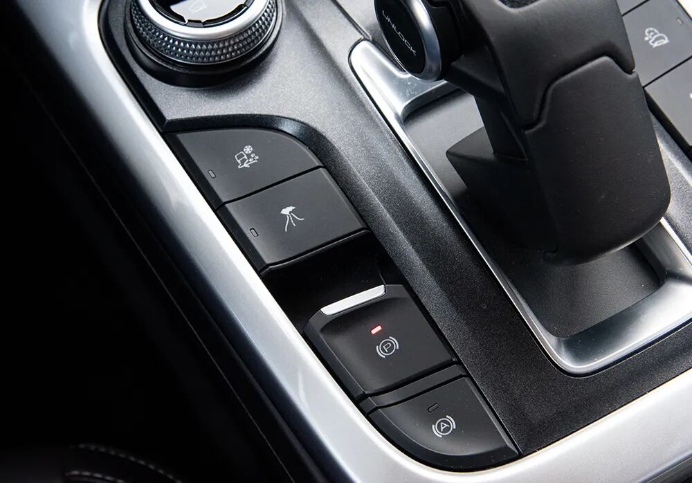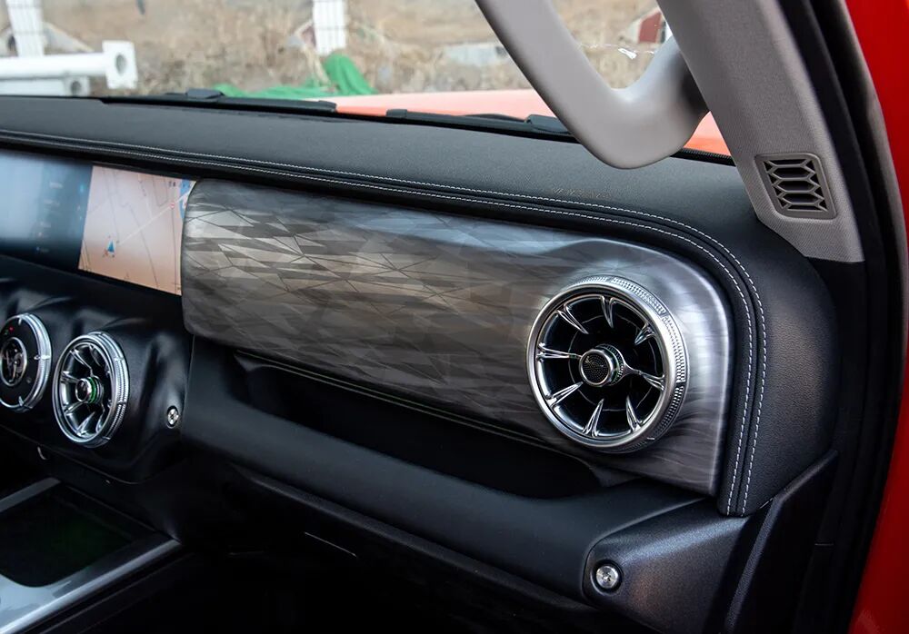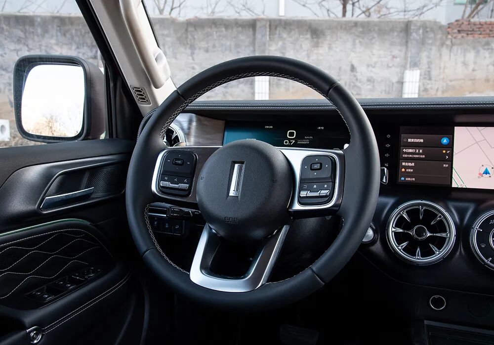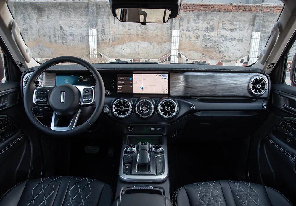进入车内,中控台造型规整硬朗,圆形的空调出风口与副驾驶前方的拉手透着股粗犷的气息。座舱内以深色为主基调,细节浅色装饰作为点缀,整体遵循了“兼顾越野与豪华舒适”的设计理念。双连屏的设计提升了车内的科技感,挡把造型类似“航空器”,诸多按键都布置在它周围,按动的手感不错,很精致。