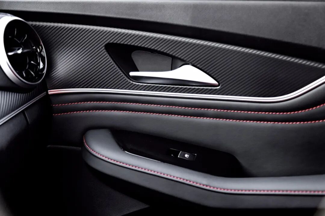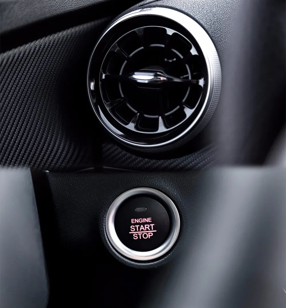 方向盘采用银色镀铬装饰点缀,很是耐看。空调出风口为圆形造型,看上去很像喷气式飞机的出气口,搭配内饰中仿碳纤维纹理的饰板,更加提升了运动感。