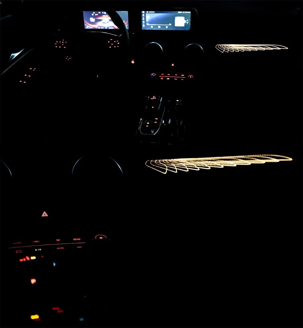 还有一点值得一提,就是东风风行T5 EVO搭载的64色内饰氛围灯。通过中控大屏可以调节氛围灯的颜色,类似天使翅膀形状的氛围灯在夜晚点亮后的效果相当漂亮。