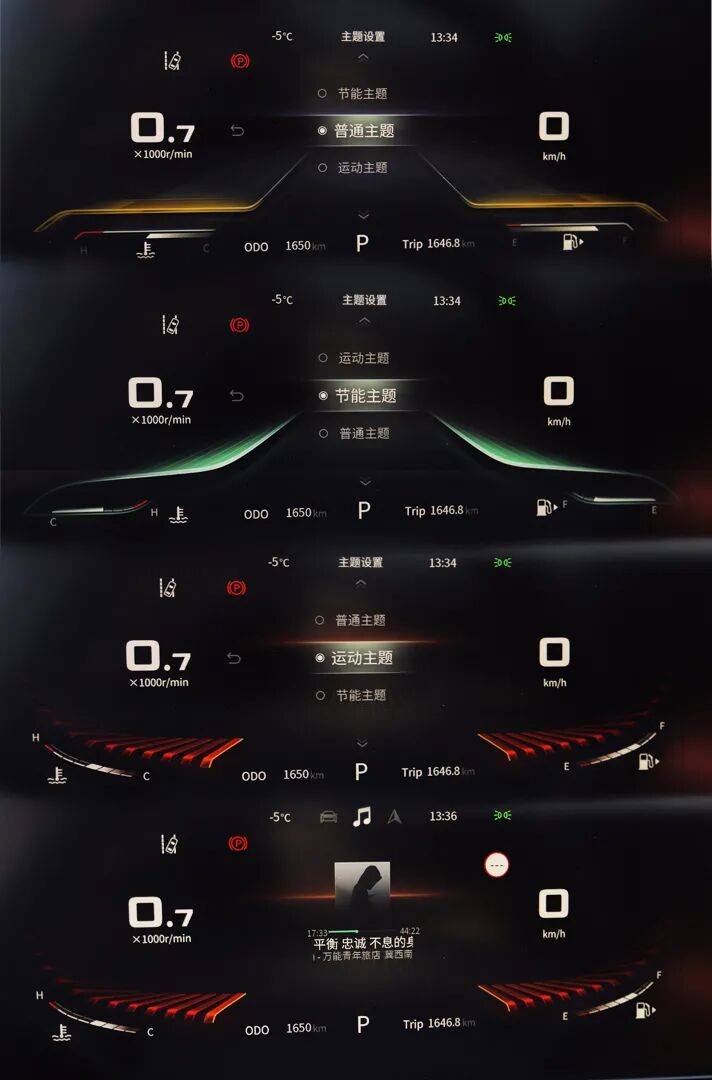 10.25英寸全液晶仪表盘显示效果清晰,分辨率高。仪表盘拥有普通、节能和运动三个主题,界面颜色和设计稍有不同。仪表盘可显示的信息很丰富,如油耗、续航里程、胎压、自适应巡航、多媒体信息等。此外,仪表盘还可以与中控屏进行互动,比如可以将地图导航挪到仪表盘位置,更加适合驾驶员观看。