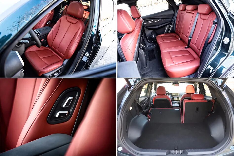 实拍的东风风行T5 EVO 2021款 1.5T DCT星耀版配备皮质座椅(可选装真皮),座椅包裹性和支撑性都不错,且前排座椅支持加热,舒适性更强。副驾驶侧面配备老板键,方便后排乘客调节腿部空间。得益于超过2米7的轴距,东风风行T5 EVO的后排空间表现很不错,腿部空间可以轻松达到近2拳。此外,后排座椅靠背支持4/6比例放倒,放倒后近乎纯平的地台也提升了装载灵活性。