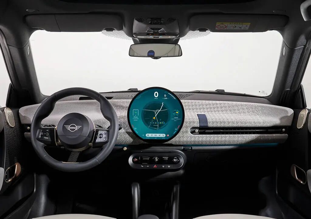 内饰采用极简的元素,仅有方向盘、圆形中央显示屏和拨杆开关。内饰同样很大程度上去保留圆形的造型,中央多媒体屏幕采用直径24厘米的窄边OLED,色彩非常正而且画质出色,还可通过投影技术将屏幕影像延伸至整个内饰面板。取消了仪表盘之后,采用HUD显示行车信息。
