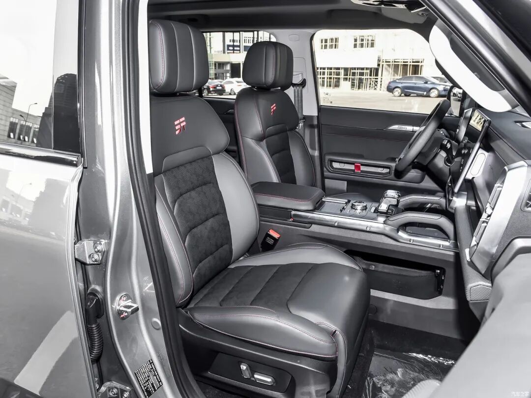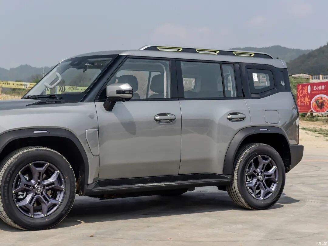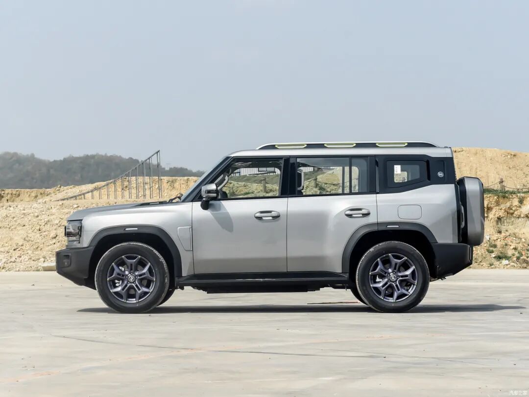侧面方正的轮廓以及前后翼子板的隆起设计带来硬朗效果和视觉张力。黑色的A/B/C/D柱和侧窗线带来车顶悬浮的视觉效果。车顶行李架的配色同前包围形成呼应。加油口在车身左侧,充电口布置在对应的车身右侧。