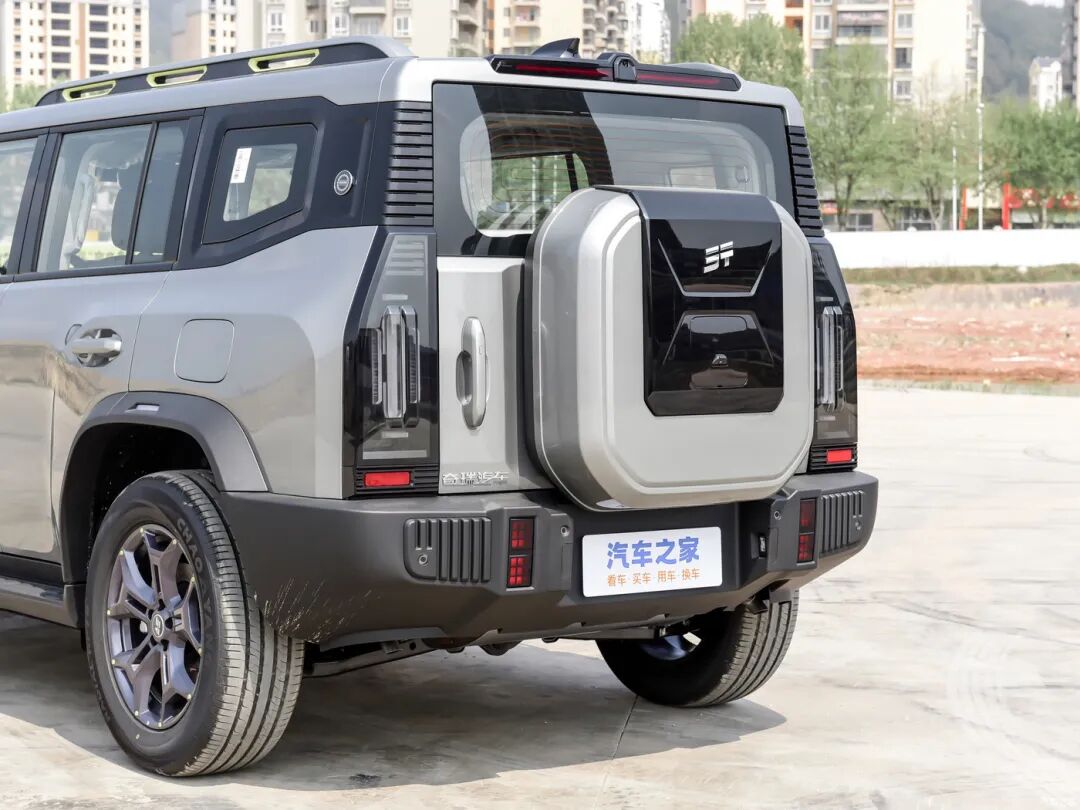 车尾采用硬派越野车常见的风格,侧开尾门,外挂小书包都没缺席,尾灯内部构造与头灯呼应。小书包上的变体“行”字是捷途的品牌LOGO。