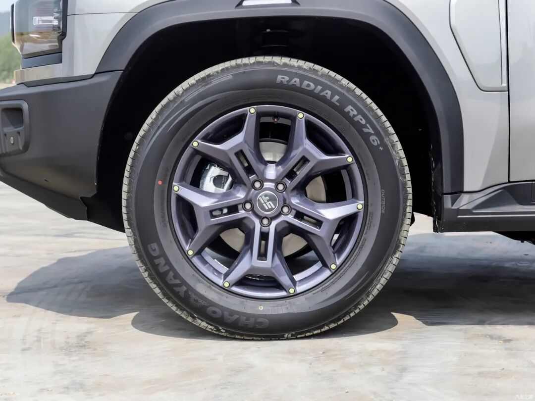 19英寸轮圈由众多Y型元素组成,灰黑配色辅以黄绿色点缀张弛有度。轮胎采用朝阳RADIAL RP76+系列,是一款偏舒适型定位的产品,规格为255/60 R19。