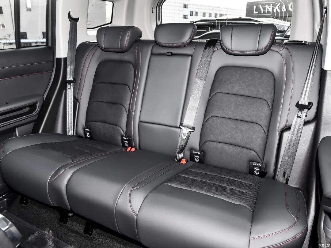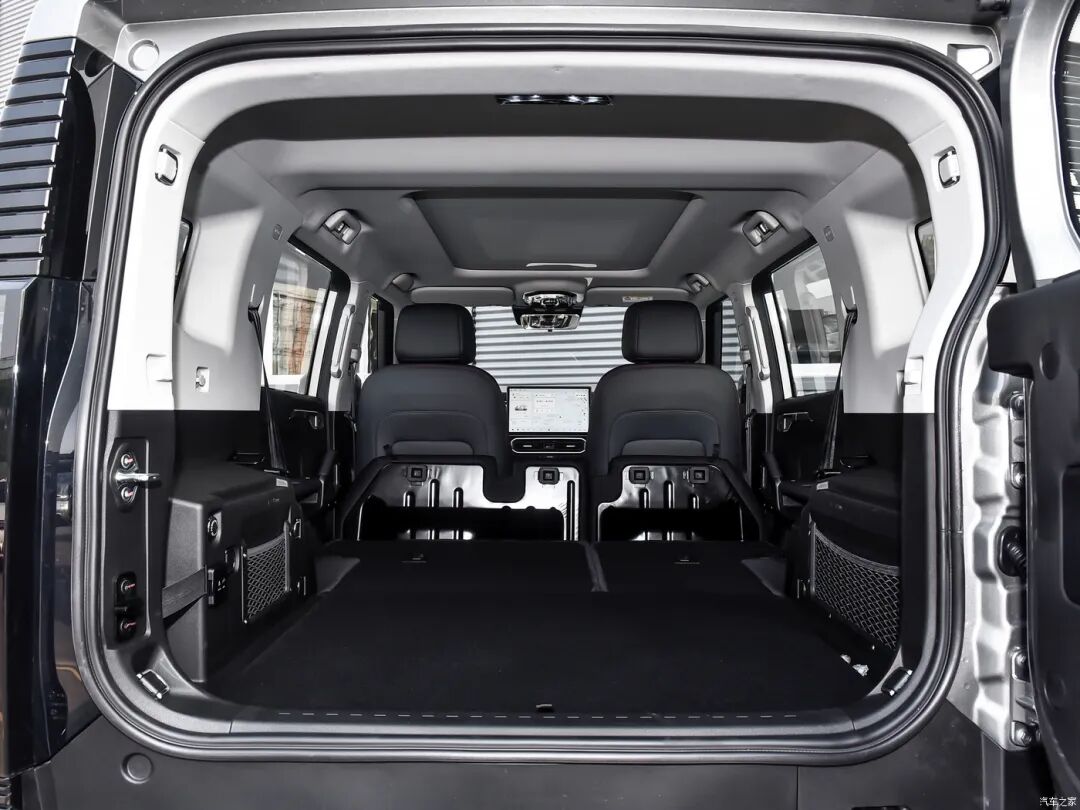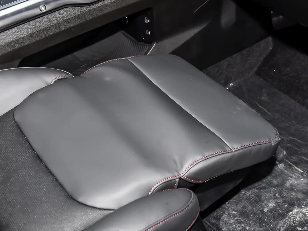 后排地板比较规整,三个座椅均设置有头枕同时座椅靠背角度有两级可调。将座垫向前翻折之后可以将座椅靠背放倒与后备厢形成一个平整的储物空间。此外,后备厢设置有网兜、锚点和220V电源接口。