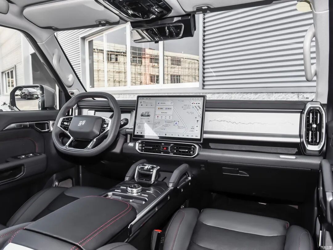 车内设计透露出硬朗的感觉,中控台采用不同的颜色和线条带来层次感。空调出风口以及方向盘造型都是显棱角的多边形设计,15.6英寸中控屏也是非常惹眼的存在。
