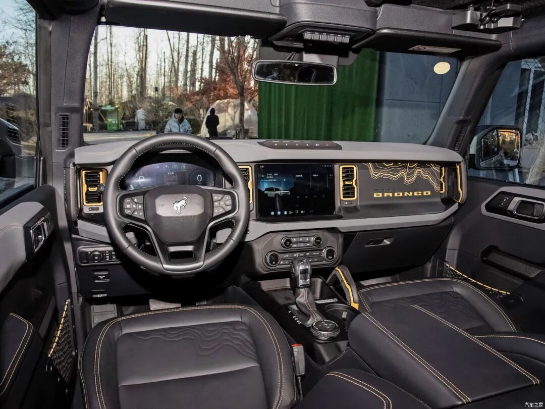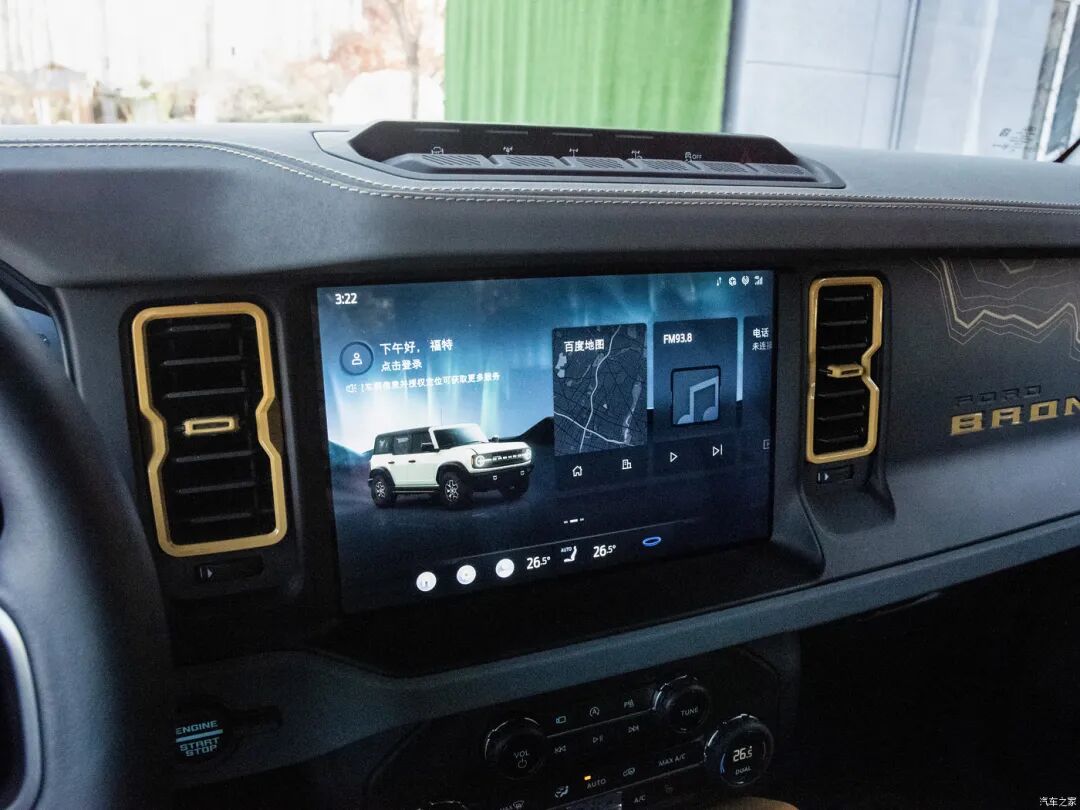 12.3英寸液晶仪表盘可显示专业化的越野信息,12英寸液晶中控屏搭载福特SYNC+智行互联系统,具有更丰富的功能拓展性与更好的稳定性,支持CarPlay、语音控制。针对中国消费者,内置高通骁龙8155芯片,搭配大内存和存储空间(16G+256G),支撑未来3-5年的FOTA升级冗余。新车还支持无人机联动,在极限环境下,中控屏直接显示无人机视角观测前路。