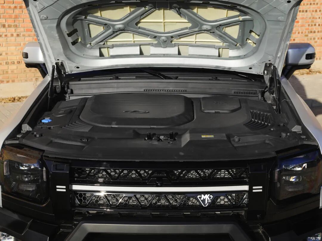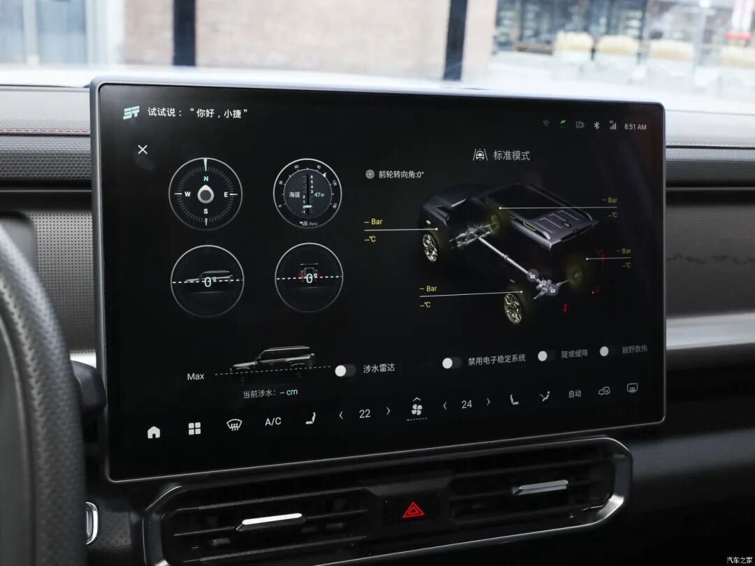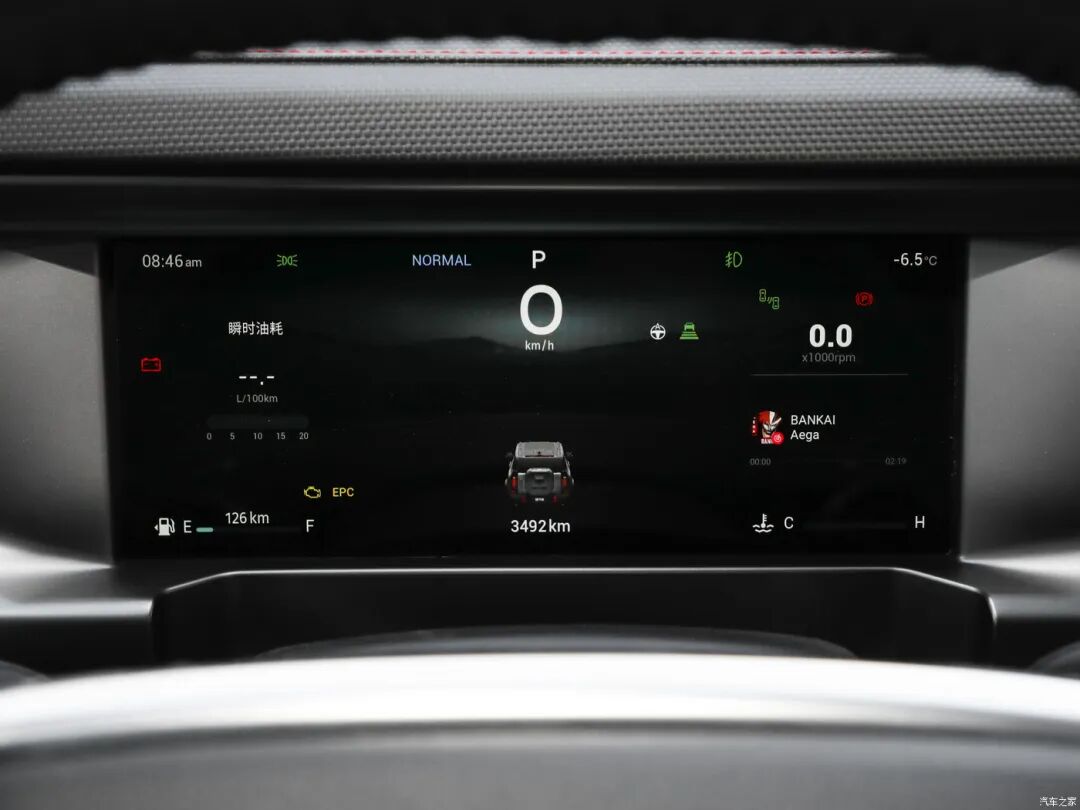 10.25英寸全液晶仪表和15.6英寸中控屏幕与普通版车型别无二致。车机采用高通骁龙8155芯片,具备语音识别控制、车联网、在线影音娱乐、导航以及车辆设置等功能。中控屏还可显示转向角度、指南针、海拔、俯仰角、侧倾角、涉水深度等越野信息。