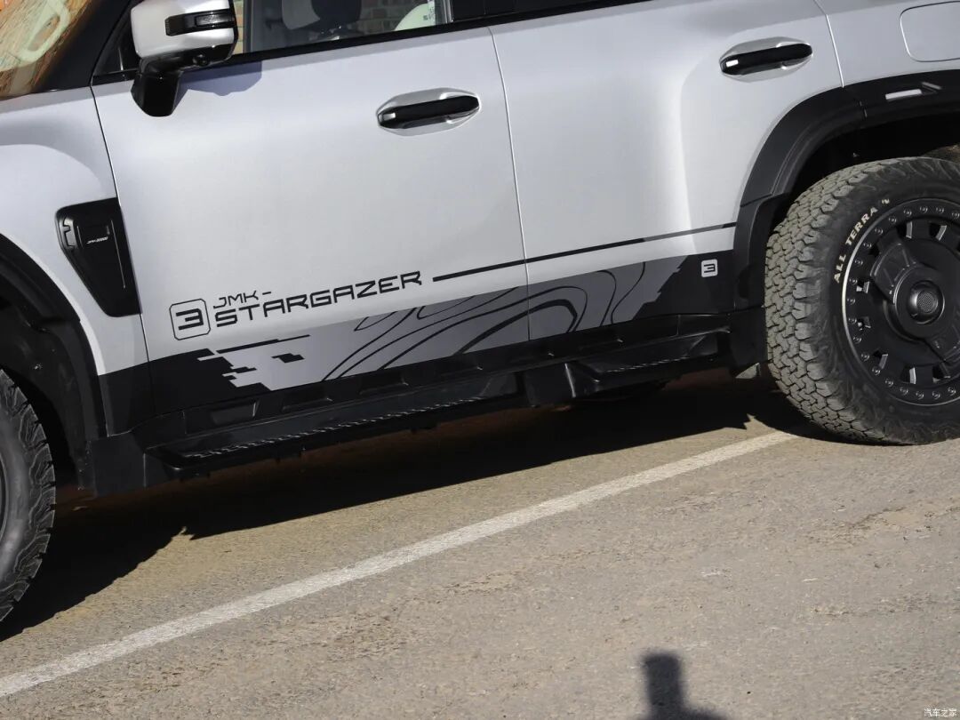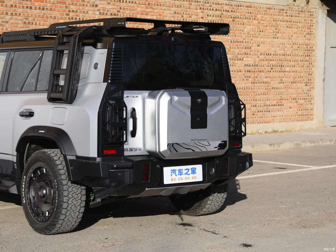 车尾上方向后延伸出张扬的扰流板,纵向排布式尾灯加上了防护罩,有实际作用而且还挺有未来感。车尾小书包带有JMK标识和拉花,后包围也是硬派风格满满。此外,这款车型全车还预留了40+处快拆拓展接口,方便升级改装。