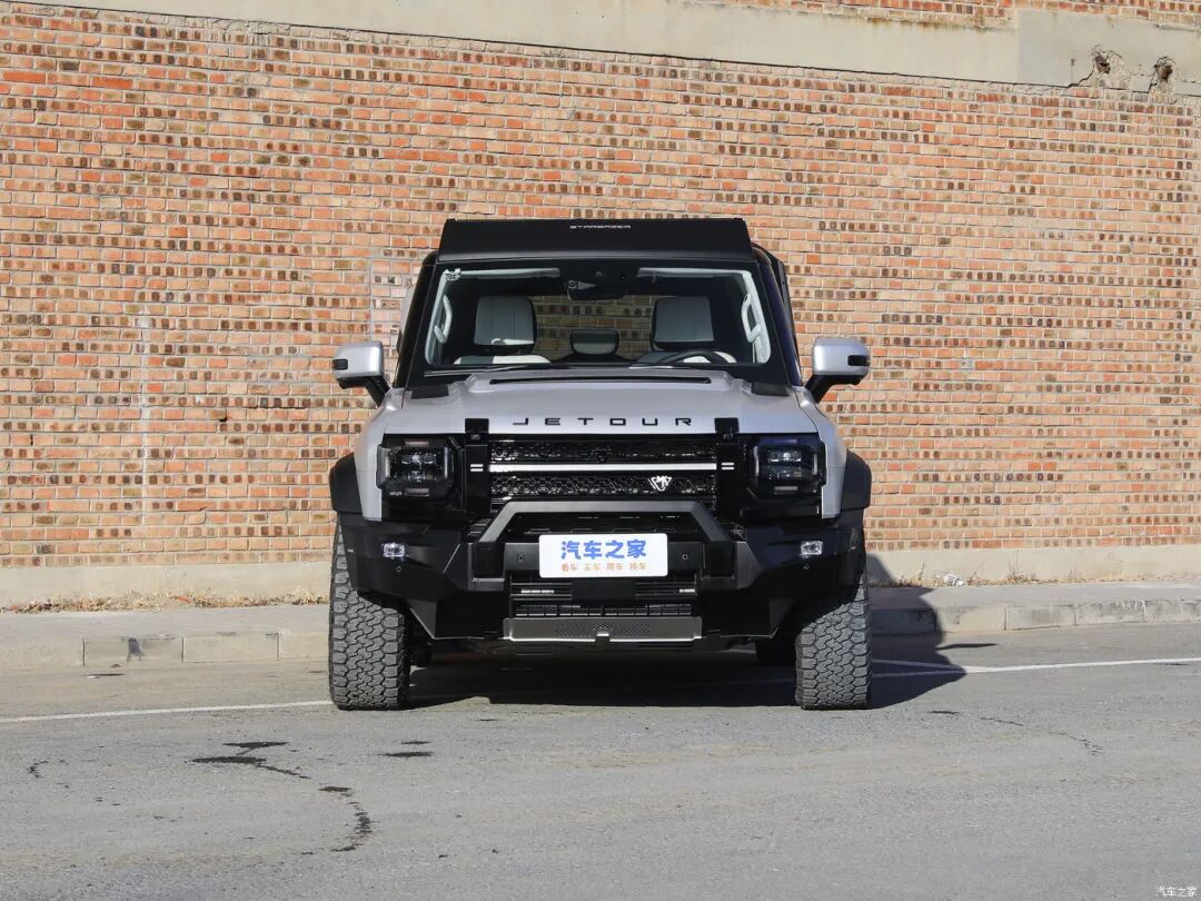 银龙之翼基于普通版旅行者打造,所以一眼就能认出这是经过强化的旅行者。发动机盖高高隆起同时还加入了黑色装饰,气势十足。JETOUR的品牌标识从中网提升至前舱盖,因为中网增加了灯带和JMK标识。前保险杠是前脸升级的重点,造型非常粗犷硬核,而且两侧还有雾灯。