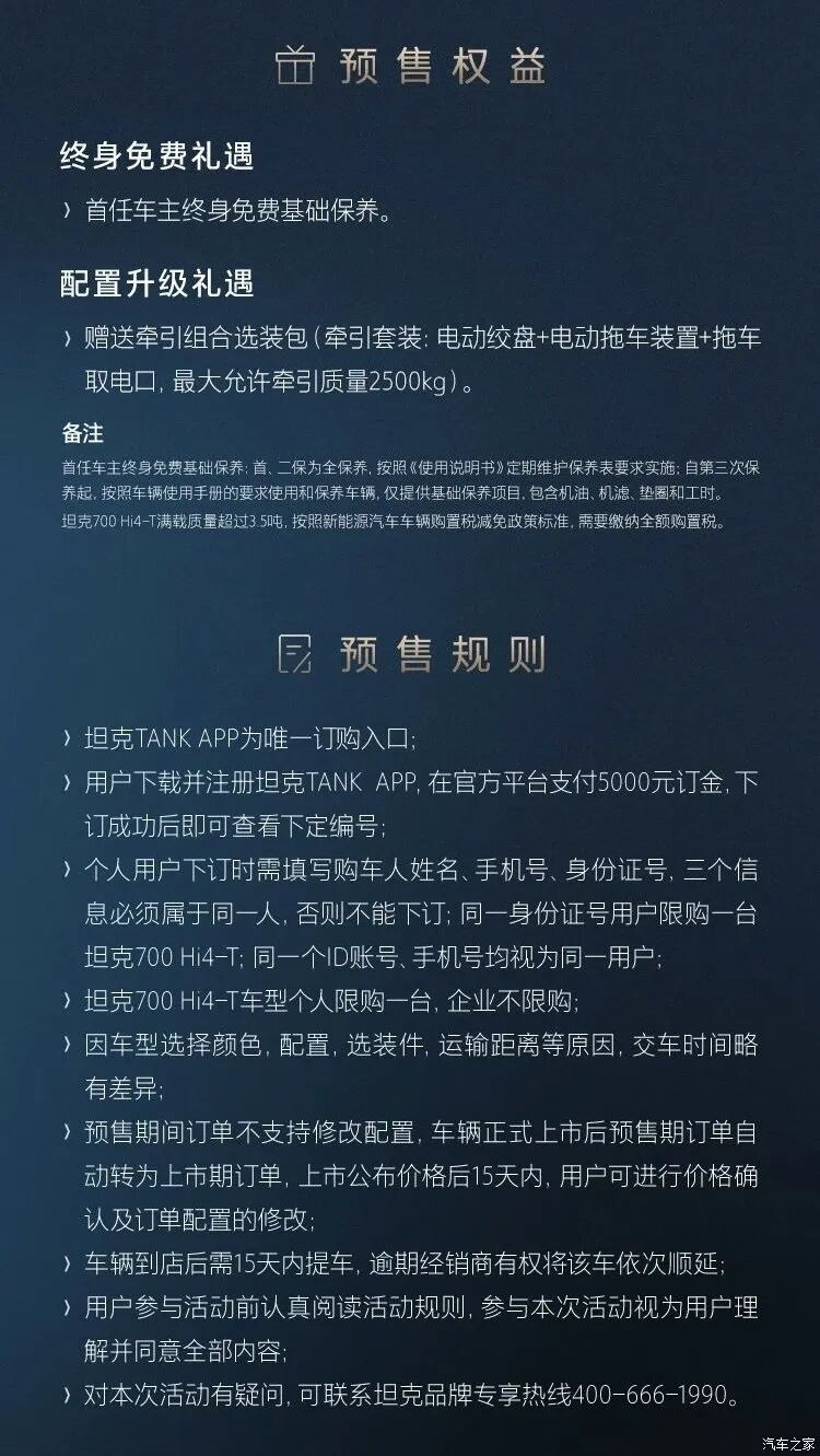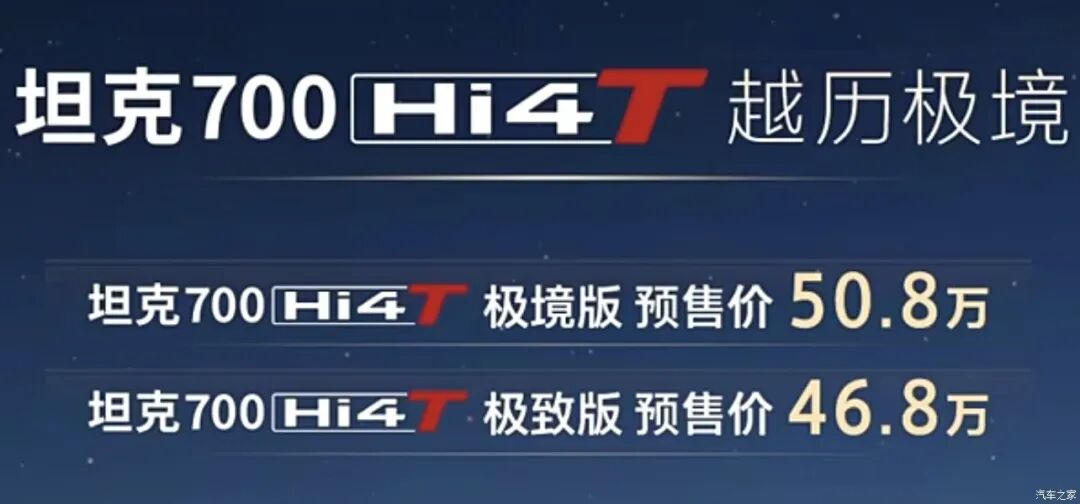 1月30日,坦克官方宣布坦克700 Hi4-T基础版正式开启预售,包含极致版和极境版两款车型,预售价格分别为46.8万元和50.8万元。相较2023广州车展期间公布的首发限定版的预售价(70万元),基础版则更为亲民。新车外观延续坦克“机甲科技”路线,造型颇为硬朗,动力上搭载3.0T+9HAT动力总成,3.0T V6双涡轮增压发动机匹配P2电机,综合功率达到385kW,扭矩高达800N·m。