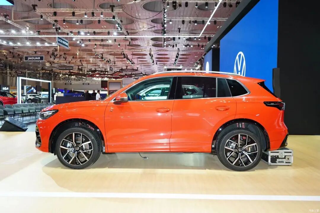 车辆侧面,新车依然拥有肌肉感极强的腰线,整个车身比例相当和谐,展现出运动车型的姿态,大尺寸的轮圈也格外抢眼。在车型尺寸方面,新车长宽高分别为4735/1859/1682mm,轴距为2791mm,长度和轴距与现款途观L保持一致,高度和宽度分别增加了20/9mm。此外,根据配置不同,新车将提供R17-R20尺寸轮圈,并拥有多种样式可选。