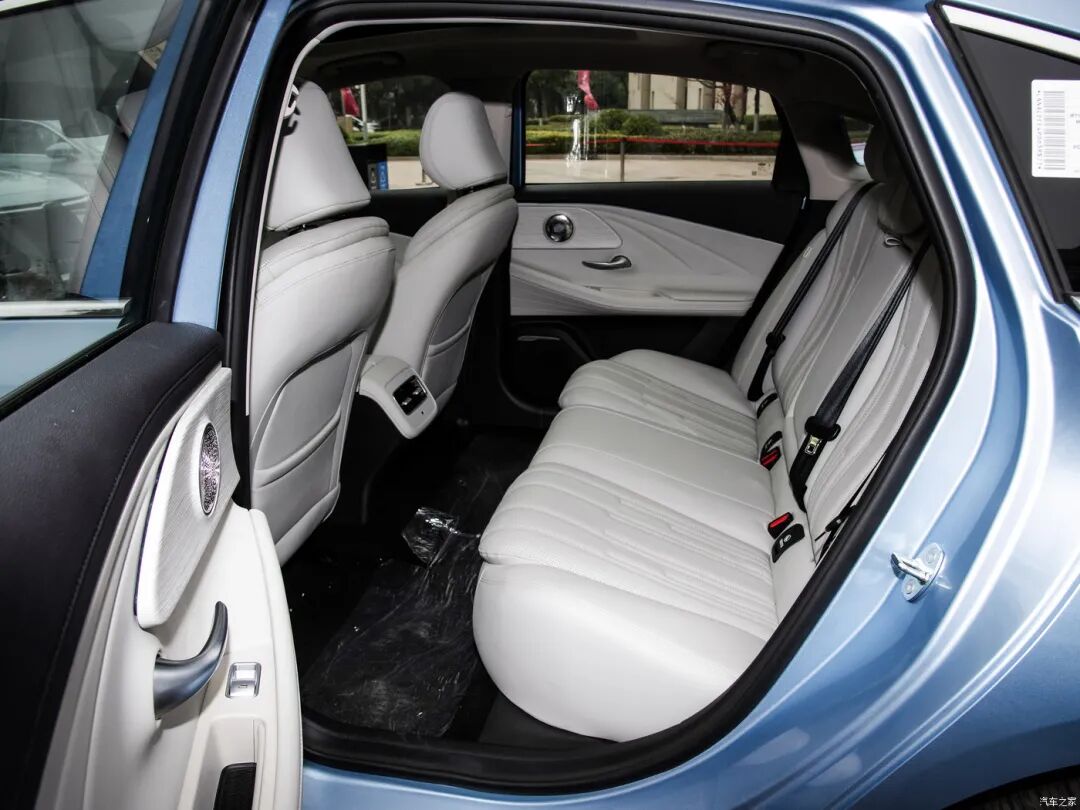 后排三个座椅都有头枕,同时中间的扶手、空调出风口、电源接口也都没缺席。后排座椅靠背还支持整体放倒以扩展后备厢空间。