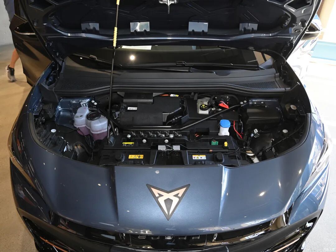 新车前舱盖隆起设计拥有十足的力量感,中间位置是凌厉的品牌标识,再往下还有CUPRA字样。整个前脸中下部分采用黑色涂装,像是深渊巨口要吞噬一切。前包围造型张力十足,内部线条纵横交错,相当夸张激进。