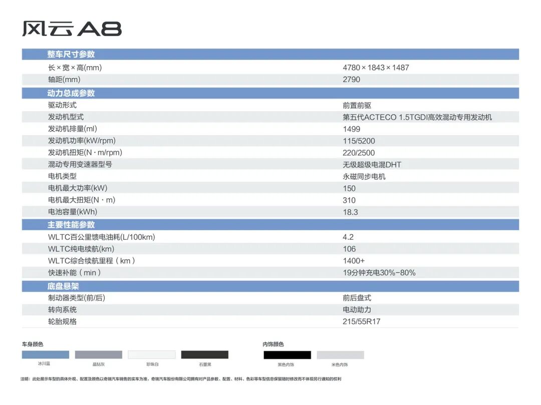 动力方面,新车将搭载第五代ACTECO 1.5TGDI高效混动专用发动机与电机组成的插电混动系统,其中发动机最大功率115kW、最大扭矩220牛·米;电机最大功率150kW,最大扭矩310牛·米;传动系统匹配DHT150混动变速箱,馈电油耗4.2L/100km(WLTC工况),综合油耗仅1L/100km。