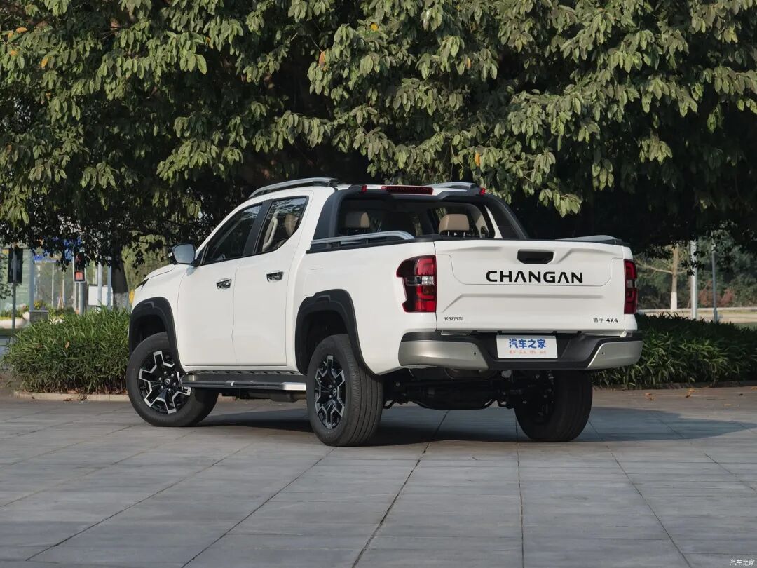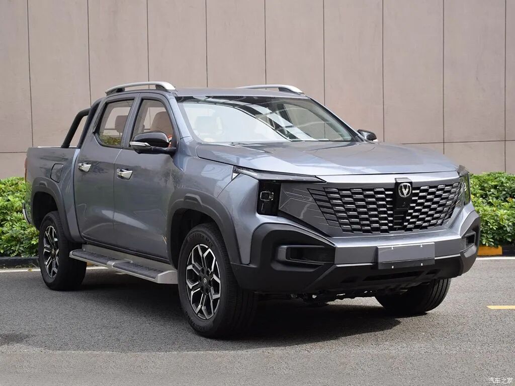 外观来看,长安猎手拥有鲨鱼鼻前脸设计,搭配全新的大灯造型,进一步提升前脸的气势。前保险杠造型十分硬朗。高配车型会在前包围两侧加入雾灯,低配车型则是纯黑色装饰。