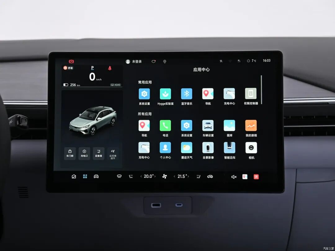 内饰方面,新车采用了当前非常流行的极简内饰设计,并未配备单独的仪表盘,只配备了一块大尺寸中控屏幕,双辐方向盘的造型比较运动。新车内饰采用了双色设计,能够营造出一些时尚感。前排中央扶手处采用了比较独特的Y形线条设计,扶手前方配备了两个杯架。