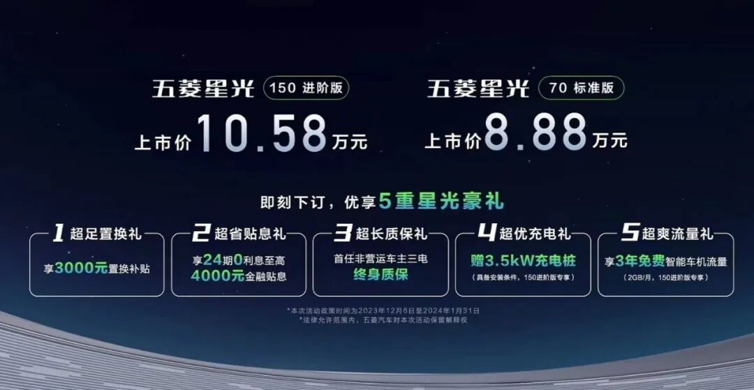 12月6日,五菱星光插混版正式上市,共推出2款车型,售价区间为8.88-10.58万元。该车是五菱旗下的首款新能源轿车,搭载了1.5L发动机与电动机组成的五菱灵犀插电混动系统,根据电池大小不同,CTLC纯电续航里程分别为70和150km。纯电动版车型则将于2024年年初上市。