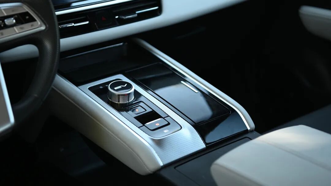 新车在中央通道处提供无线充电板,旋钮换挡操作机构显得较为高级,在换挡机构右侧以及后方设置有带盖板的杯架/置物槽,实用性和美观程度均比较出色。