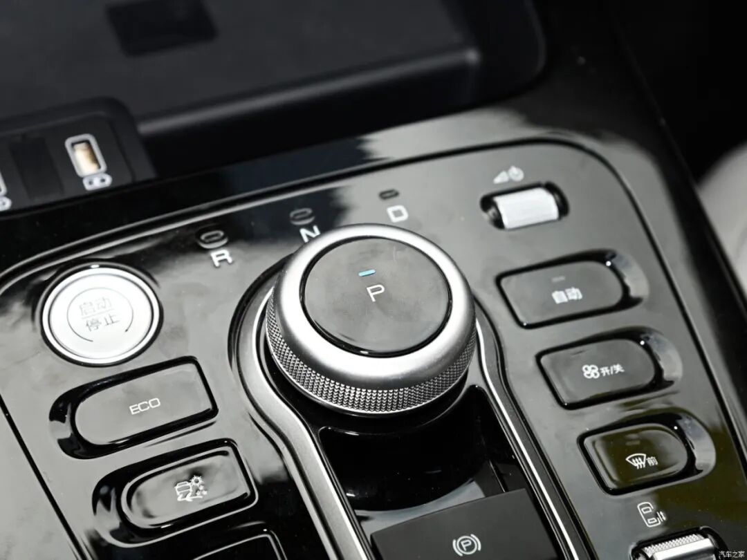 旋钮换挡机构集成在“功能岛”之上,前方有储物格,四周则是一键启动、驾驶模式切换、电子手刹、自动驻车、空调、电动侧滑门等功能的控制按键。