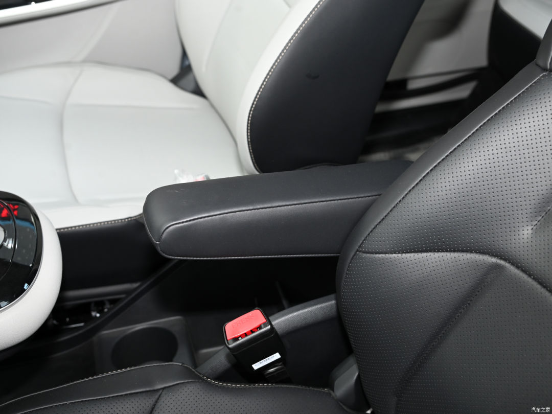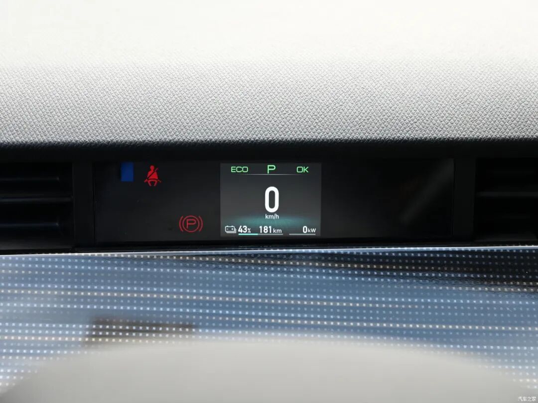 仪表盘隐藏在贯穿式空调出风口内部,好处自然是令内饰更加规整,但劣势就是有点太小了,常用的时速、电量、续航里程、挡位等信息都有显示。