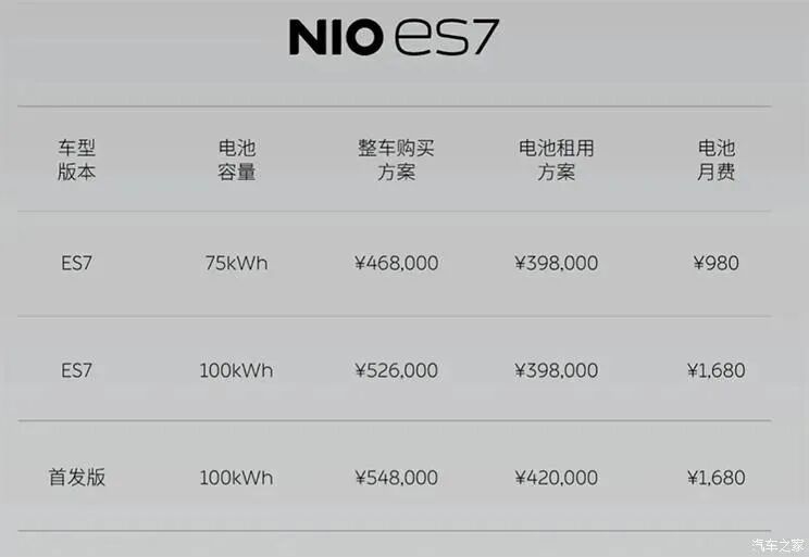 蔚来ES7的厂商指导价为46.80-54.80万元,提供两款不同容量的电池组,分别为75kWh与100kWh,CLTC综合续航里程根据电池容量与轮圈尺寸不同,可达450-620km。未来,ES7还将提供150kWh电池组,CLTC综合续航里程可达930km。