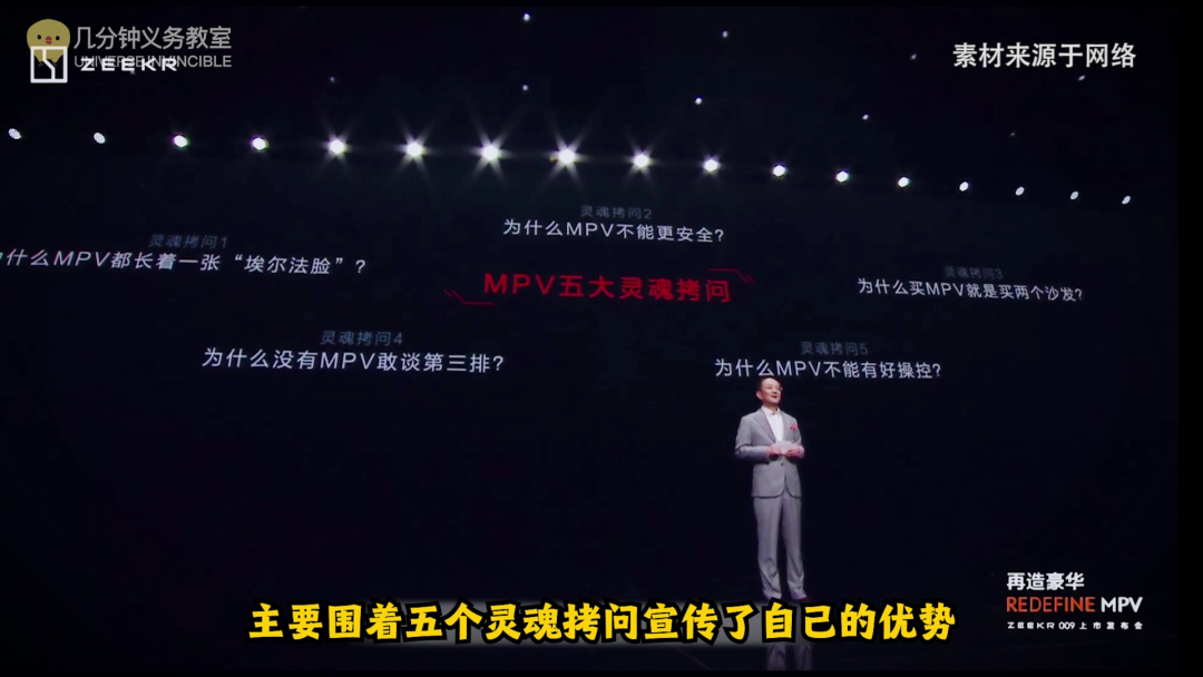 009发布会主要围着五个灵魂拷问宣传了自己的优势,第一个问题为什么MPV都长着一张埃尔法脸?这主要是宣传它的设计。我很认可他这个疑问,因为我也不喜欢一个东西火,就一堆跟风的,但我没法用好不好看判断009,我觉得它像Lady嘎嘎,有创意,质感也一定不错,但是我的审美比较传统。