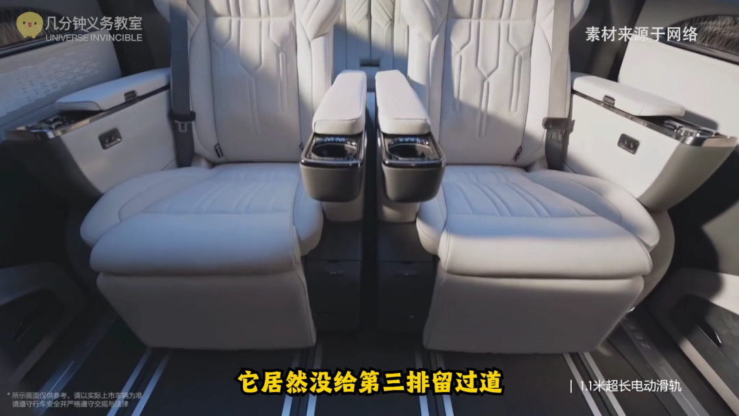 相对于第二排,我觉得009的第三排吹得毫无道理,009宽两米多,这么宽的车身,它居然没给第三排留过道,发布会上给的理由是从中间走不体面,我听这话以为009为了体面在第三排侧面搞了个隐藏门,结果是把第二排座椅前移,从这过去,和走中间过道一样,还得撅着屁股,如果秘书的腰臀比足够完美,想象一下这也算个优点,而且它第二排是电动调节,第三排进去之前得等,进去之后再等。在外面等着也不是那么体面。