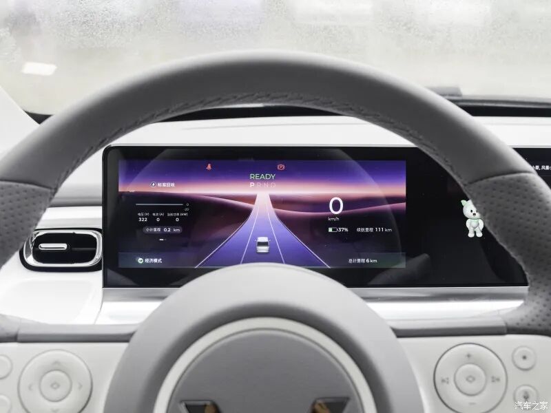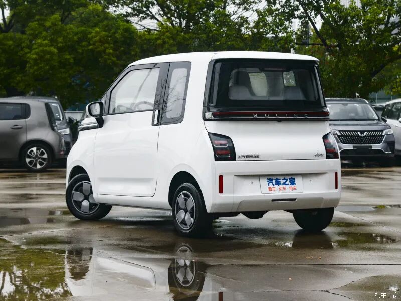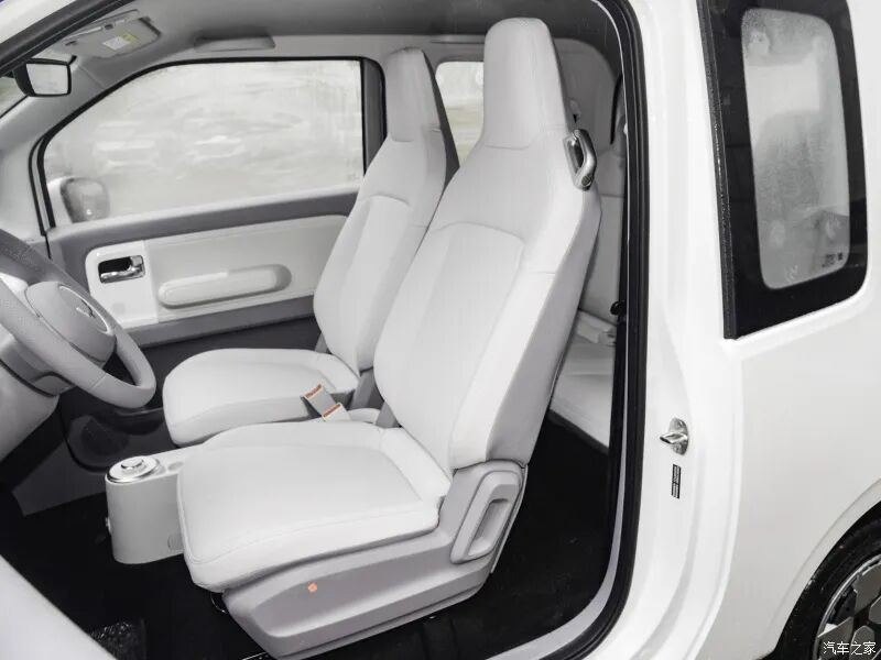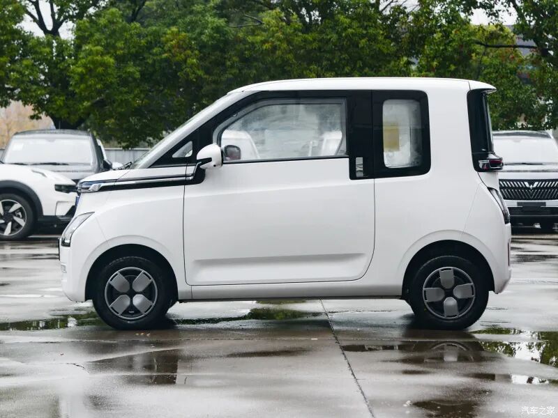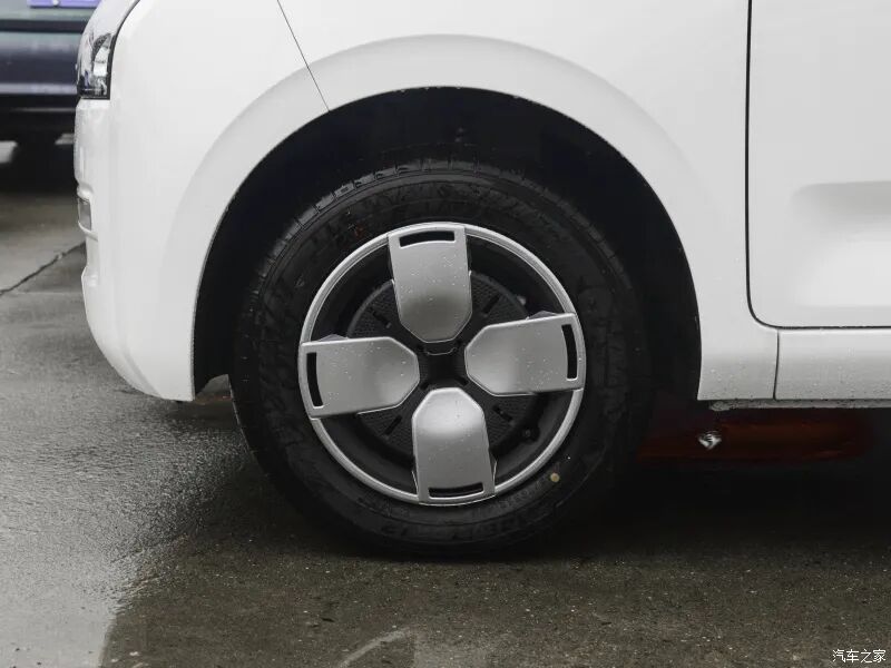 实拍车型为四座版本,在车门后方舷窗采用纵向延展处理,对于后排乘客采光提供一定帮助。车身尺寸方面,新车长宽高分别为2974/1505/1631mm,轴距2010mm,整体尺寸和宏光MINIEV较为接近。12英寸低风阻轮圈造型较为简洁,银色轮圈罩和车辆整体造型风格较为贴合。