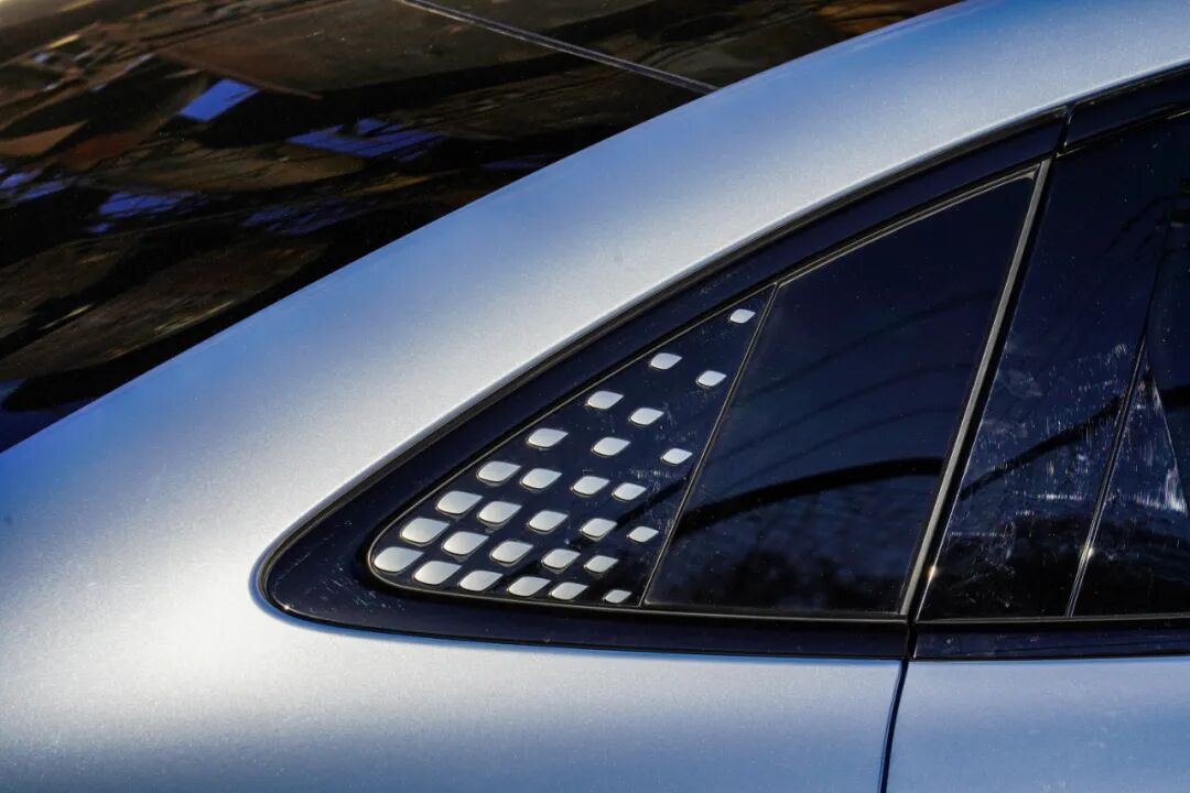 车侧细节的设计不乏亮点,包括前轮翼子板的装饰件、侧裙以及后排小三角窗的装饰件,最为吸睛的还当属后排小三角窗的装饰件,多个水滴元素可与“海洋美学”设计理念相呼应。