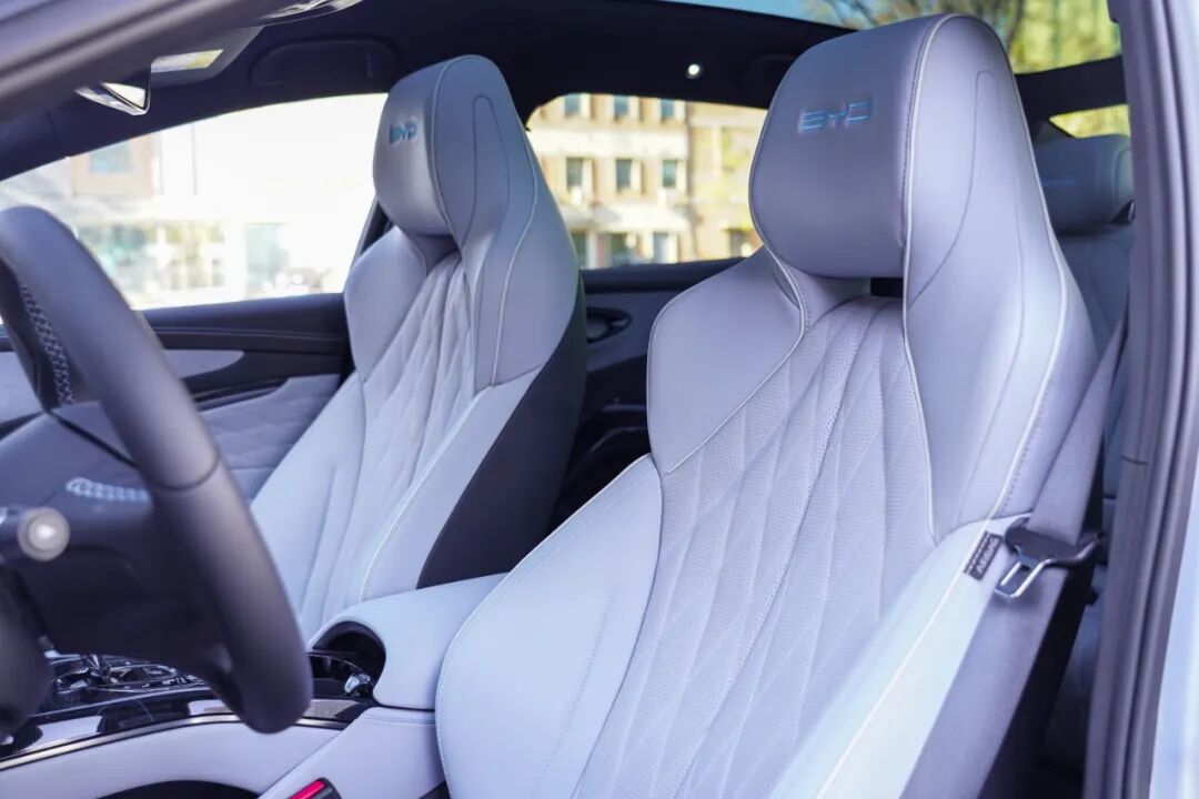 一体式座椅造型够运动,可以看到头枕上方还带有”BYD”刺绣点缀,细节处理到位。填充物整体偏软,有美式大沙发般的舒适度。此外,通过其侧翼的规格也能看出该座椅的包裹性不差,实际体验中,哪怕是激烈驾驶也能提供良好的支撑性。