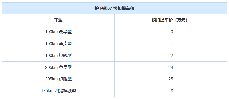 前不久网络上也曾曝光过该车的预扣提车价(经销商从厂商提车价格),根据纯电续航和配置的不同,可分为6档配置,纯电续航有100km、175km和205km不等,预扣提车价格在20-28万元。比亚迪护卫舰07实车已经到店,感兴趣的朋友可以去经销商处实际体验。