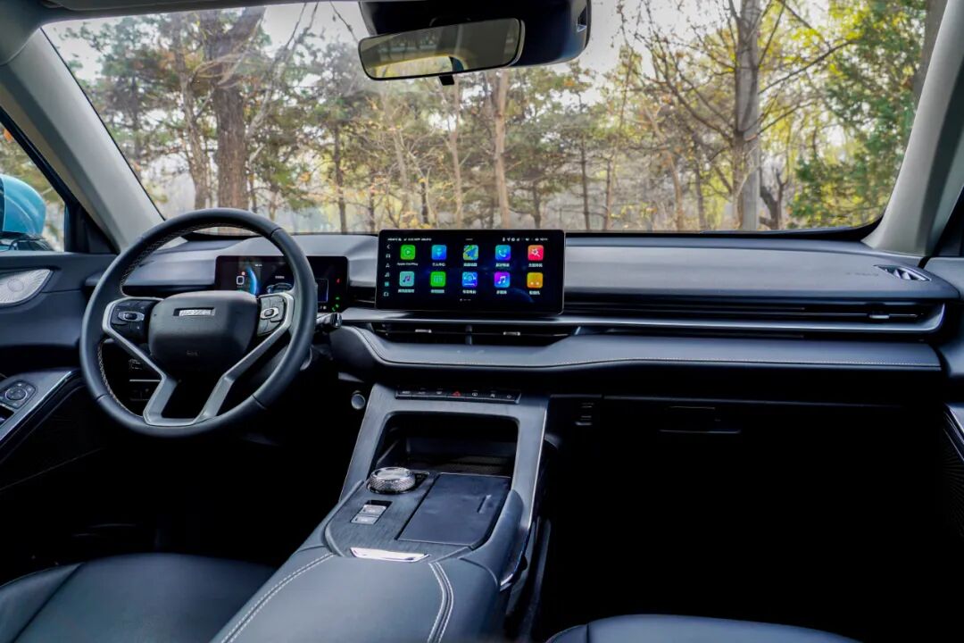进入车内熟悉的感觉扑面而来,依旧是燃油版车型的那套设计。相比于联屏设计,哈弗H6车系的双悬浮屏流让人觉得更新颖,也多了几分造车新势力产品的味道。整体造型以横向线条为主,视觉上尤为舒展,而银色饰条的出现则将内饰的质感得以拉升。