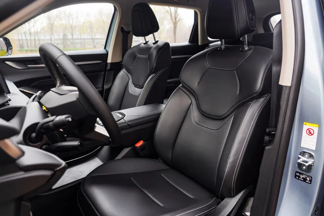 宽大的座椅偏舒适取向,符合车型定位,不论是包覆皮质还是填充物都比较柔软,乘坐时会有一定的陷入感,然而,侧翼的支撑性还有可提升空间。至于空间方面,整体表现与燃油版车型一致。