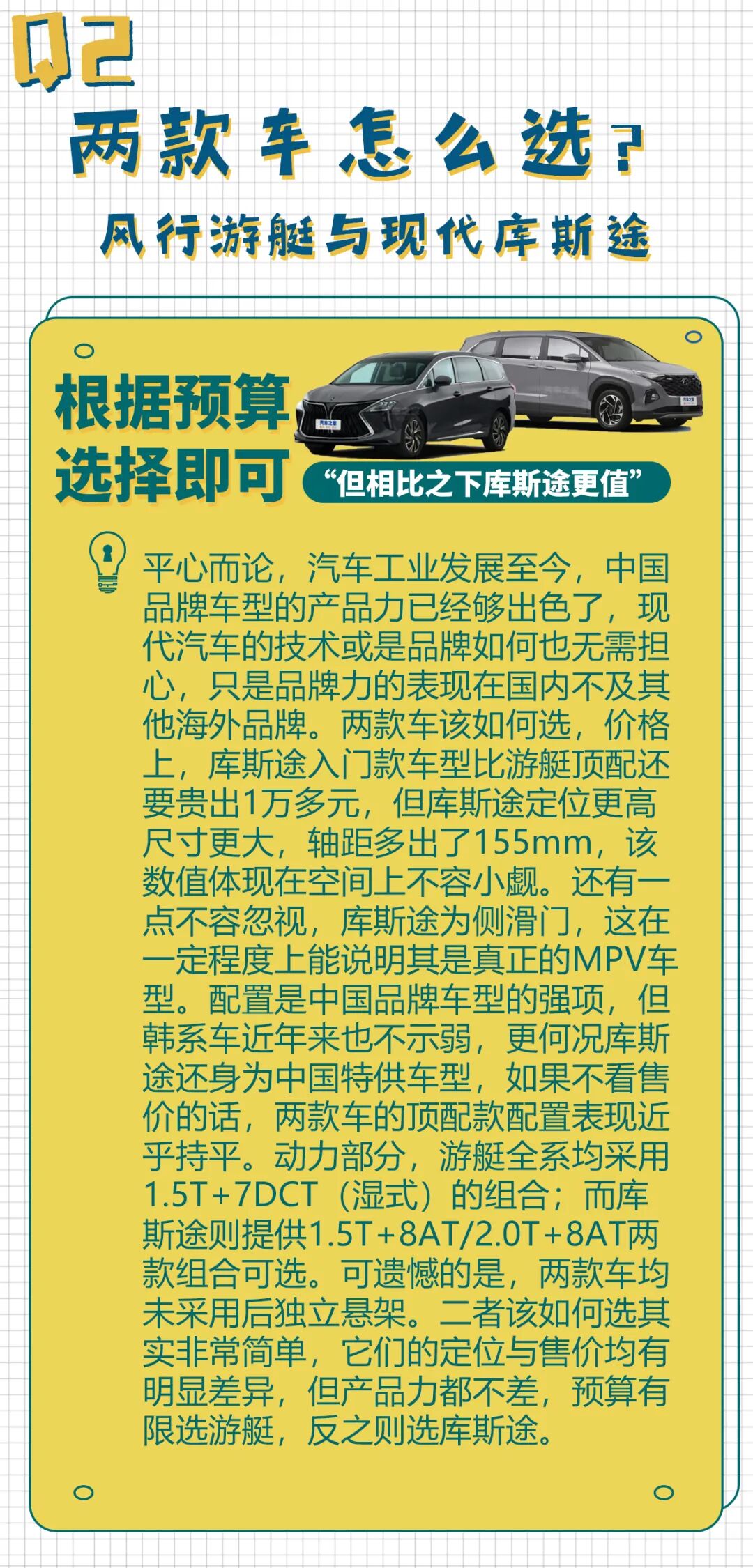 Q2,东风风行游艇和现代库斯途怎么选?预算充裕就入手库斯途,反之选择游艇也可,两款车都不错。
