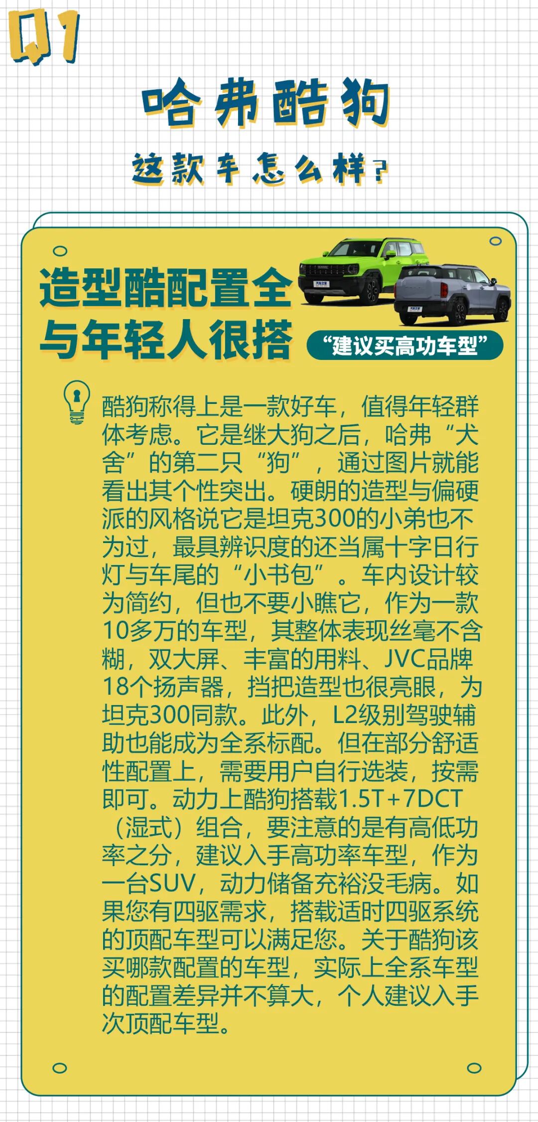 Q1,哈弗酷狗怎么样?视觉层面与车名一致,个性很足,更适合年轻用户;配置上也很有诚意,为了讨喜年轻人,看得出设计师的用心;而动力部分,提供了高低功率车型,建议选高功。总的来说,同价位下,酷狗是一款不错的车型,其竞品也是少之又少。
