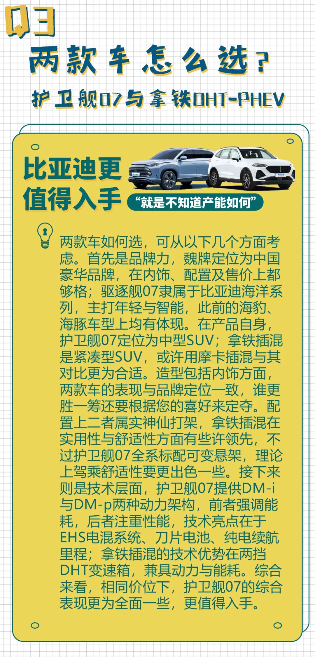 Q3,比亚迪护卫舰07和魏牌拿铁DHT-PHEV怎么选?综合实力对比来看,护卫舰07更胜一筹,不过还是要等比亚迪给其一个合理的价格。