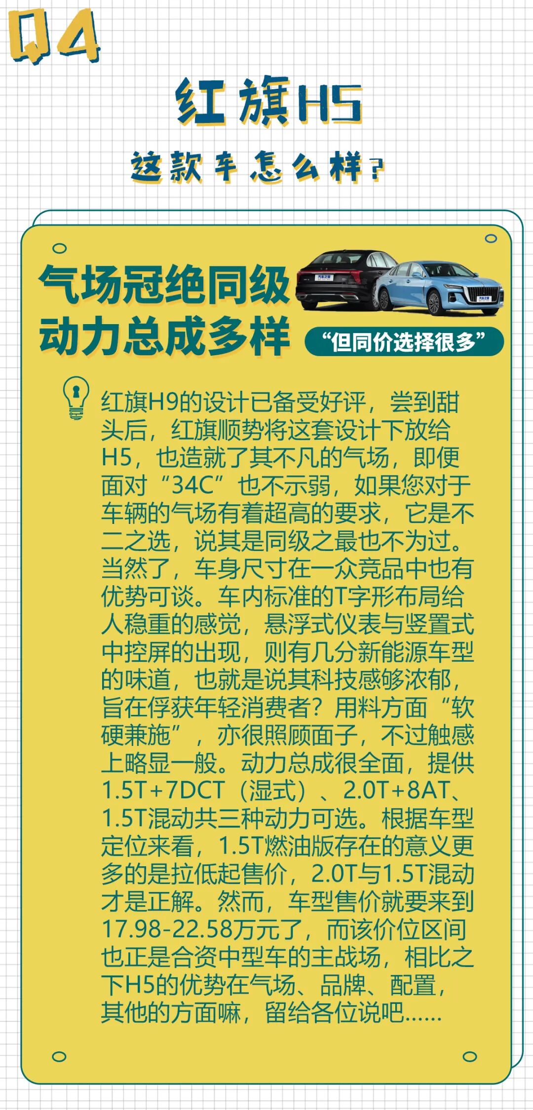 Q4,红旗H5怎么样?气场没得说,冠绝同级,至于其他方面各位可自行对比。