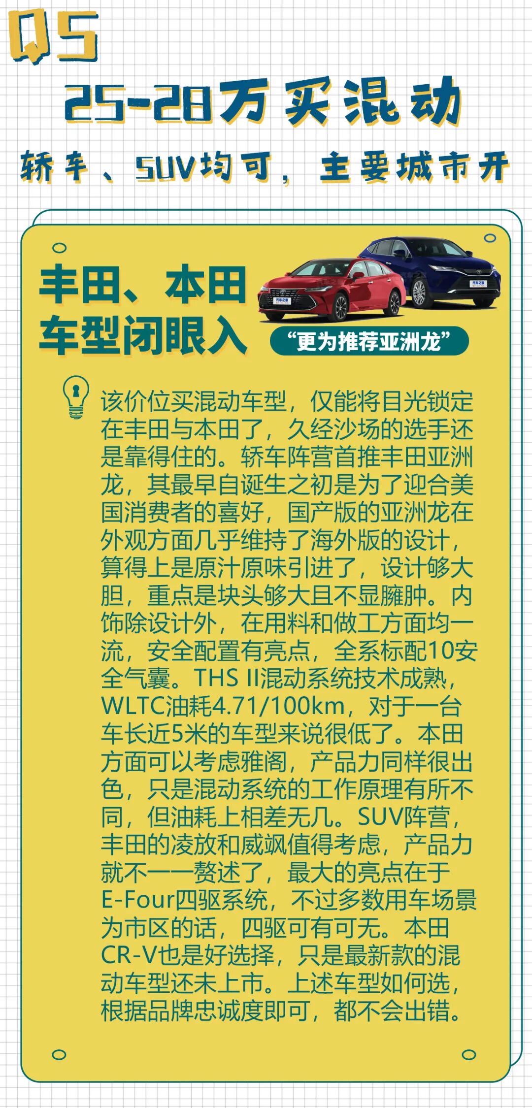 Q5,25-28万买混动,SUV和轿车均可,多数用车场景为市区,偶尔高速。丰田亚洲龙可以视为首选,除内饰外,挑不出问题,车长近5米,百公里4.71个油,标配10安全气囊,整体表现很出色。