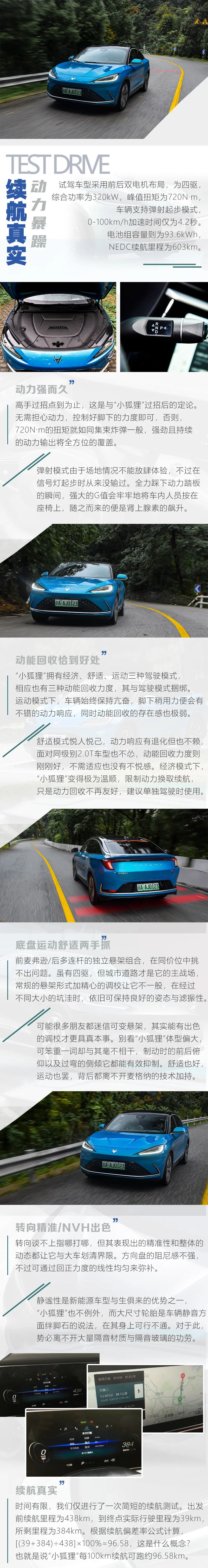 还有一点,相信各位也会非常感兴趣,那就是用车费用。“小狐狸”93.6kWh的电池组按照当前充电桩均价1.6元/度来计算,充满电需要大概150元。按照上述续航偏差率来计算,其实际续航里程大概为583km,如此的话,每公里耗电约为0.26元。(续航测试环境:当天气温16-21°,空调24°风量一挡)